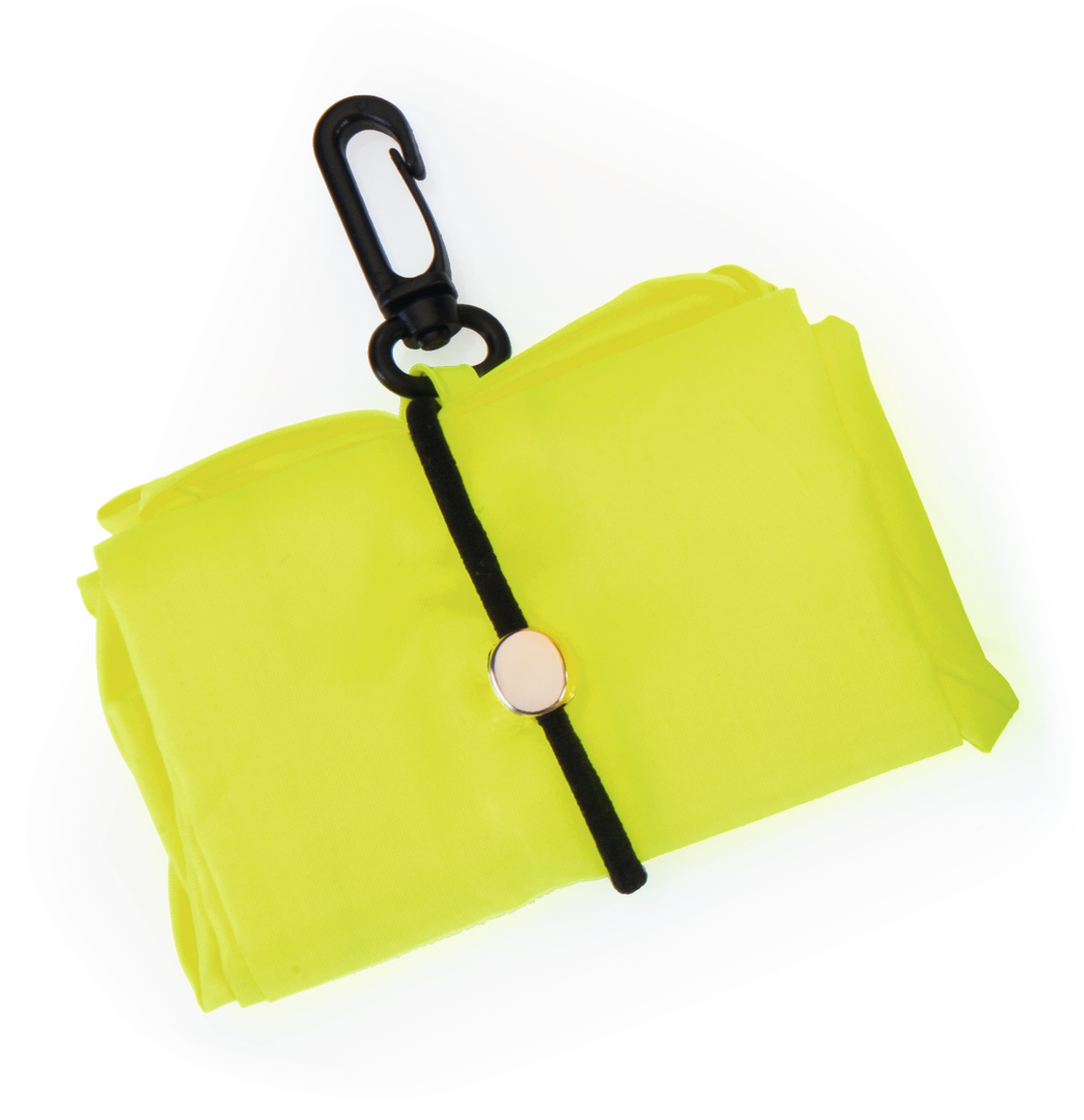 Bolsa plegable en resistente y suave poliéster 190T en vivos colores fluorescentes. Con gran asa y goma para plegado con accesorio de ajuste. De acabado cosido y plegado de pequeño tamaño, con fuelle y mosquetón de transporte.