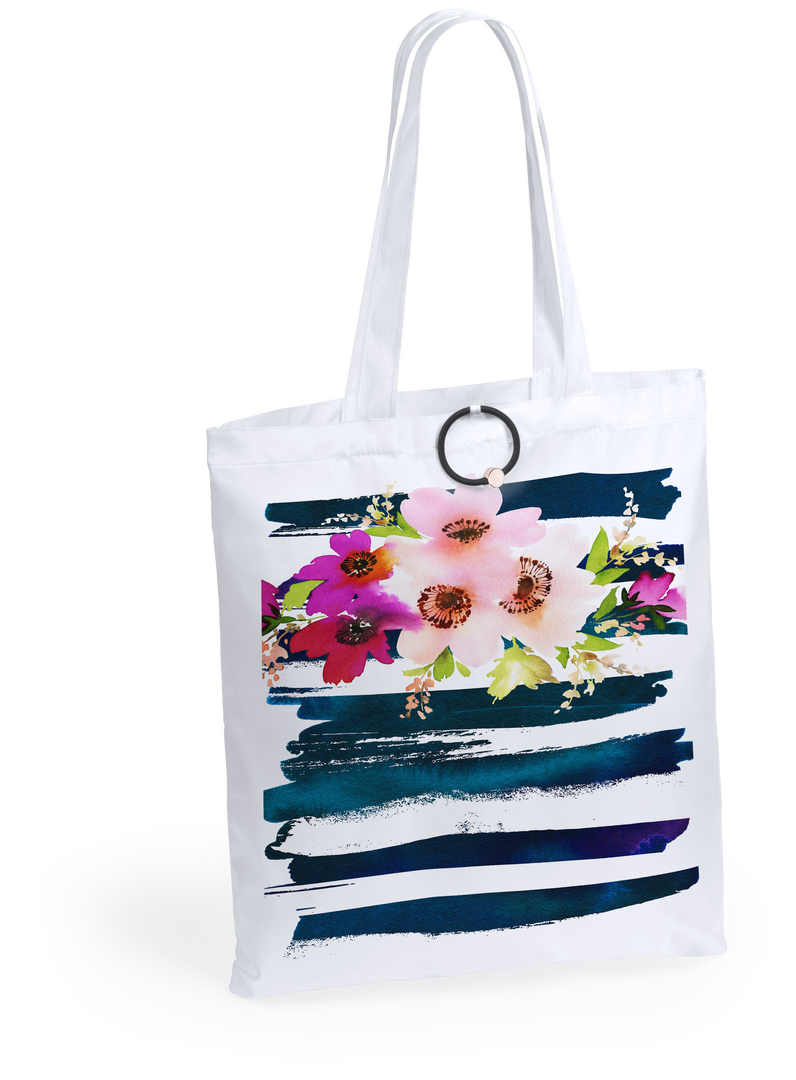 Bolsa plegable en divertidos y variados colores. De suave poliéster 190T, con elástico para plegado y de acabado cosido.