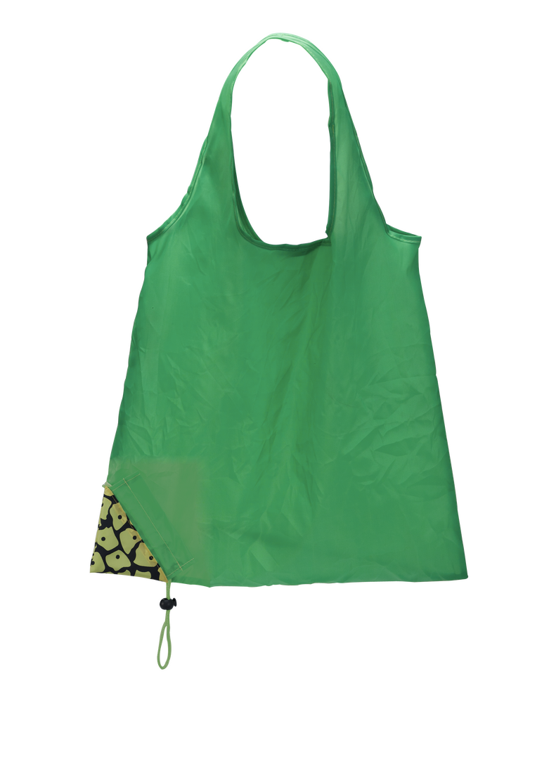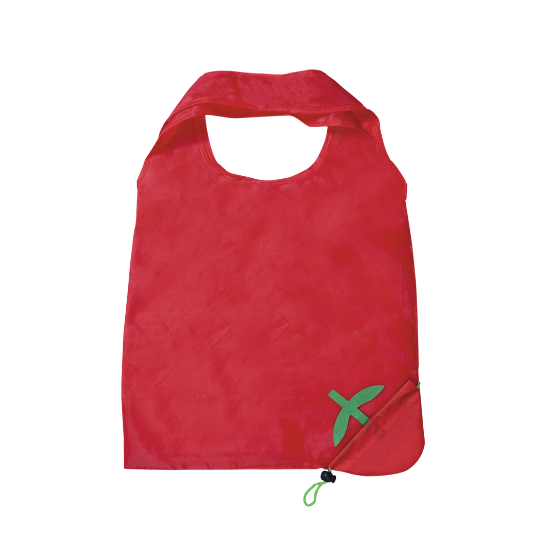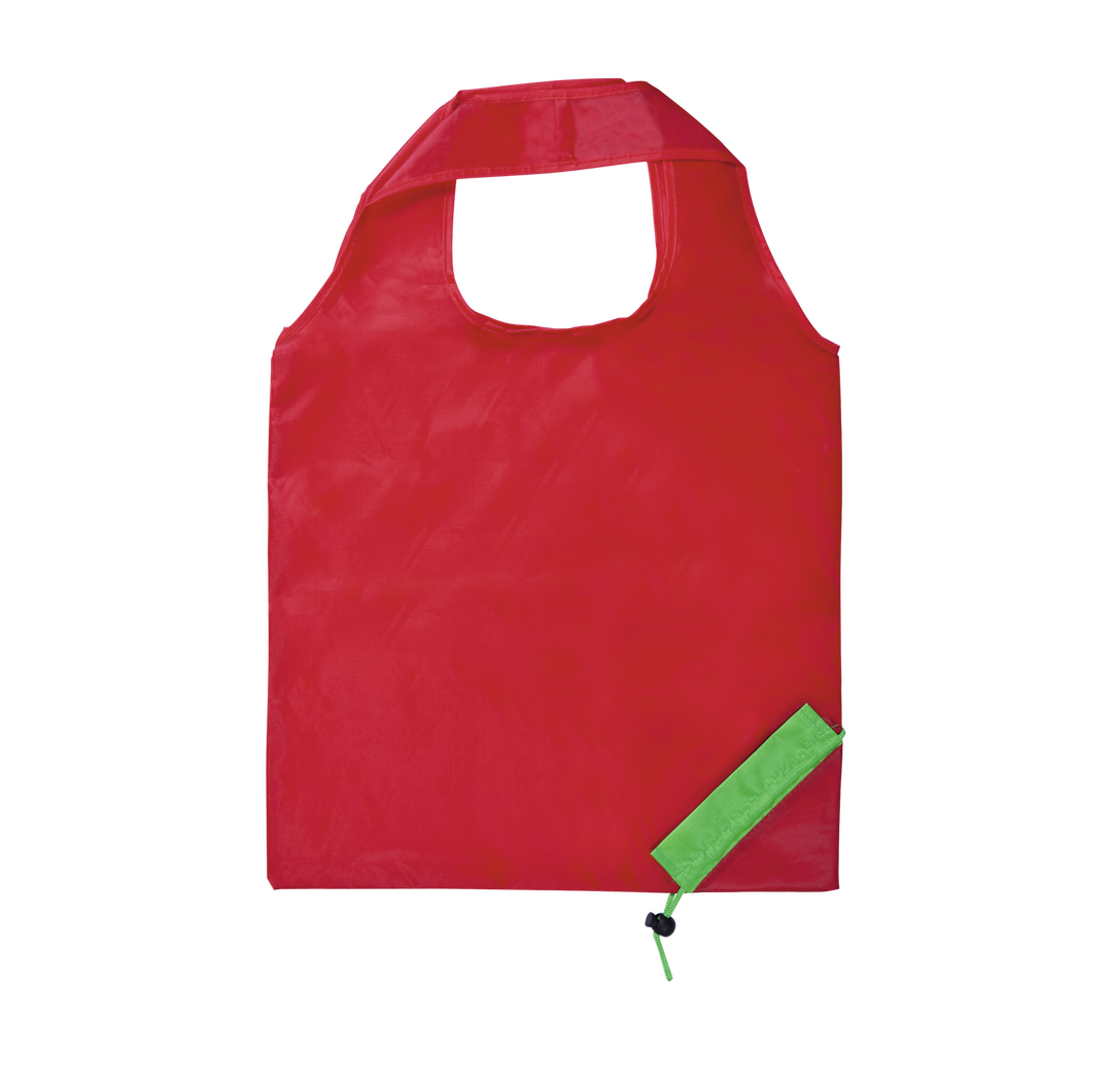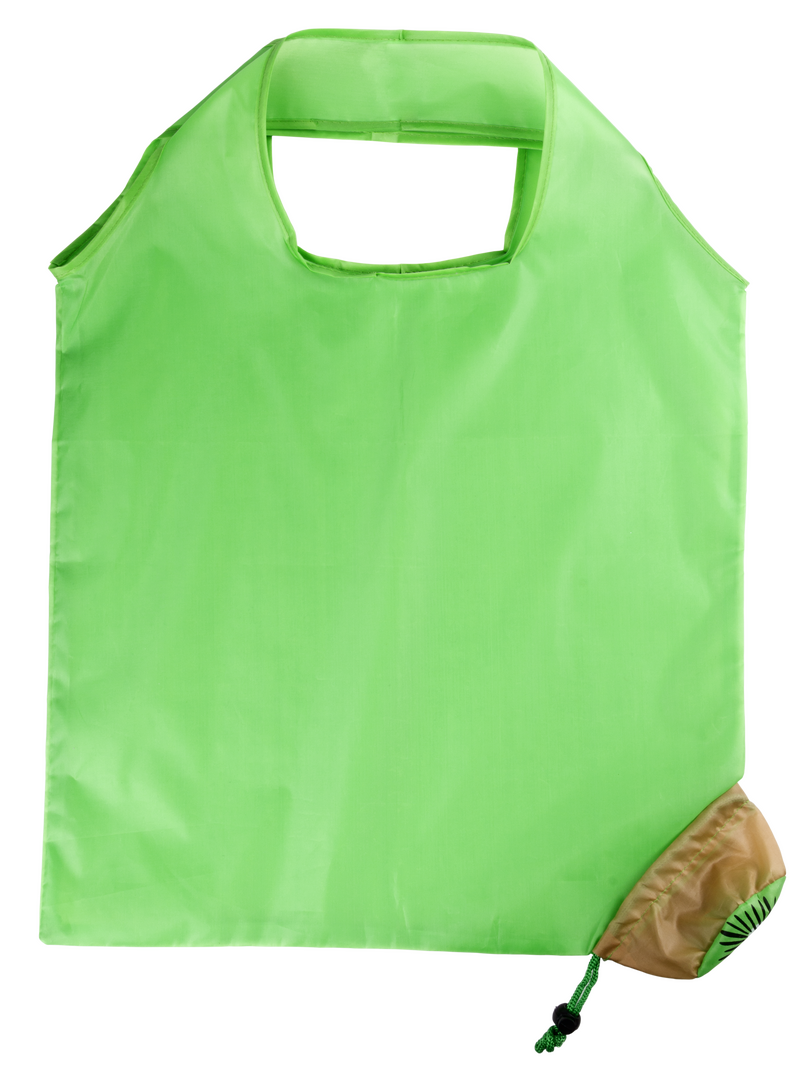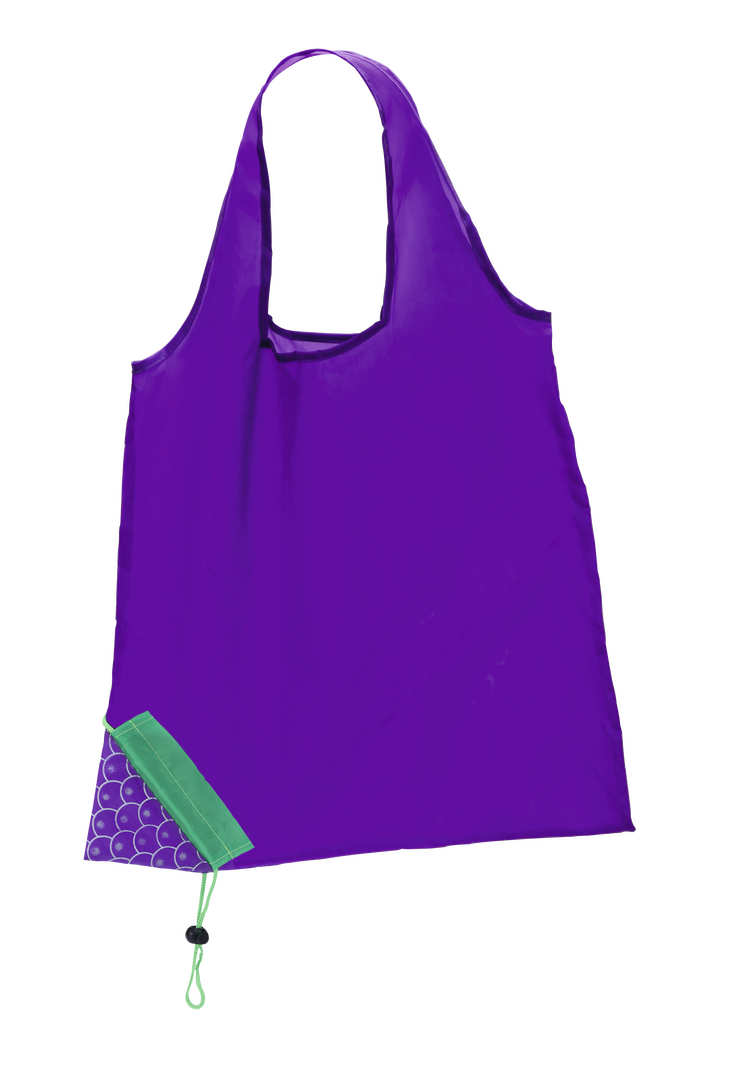 Bolsa plegable de divertidos diseños de frutas en llamativos colores. De suave poliéster 190T, con cordón y accesorio de ajuste.