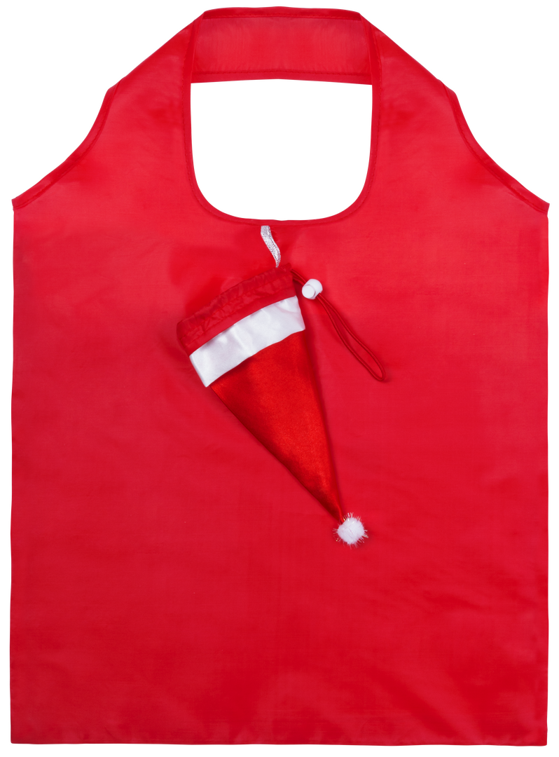Bolsa plegable de divertido diseño navideño en llamativo color rojo. De suave poliéster 190T, con acabado cosido y bolsita para plegado en forma de gorro de Papá Noel.