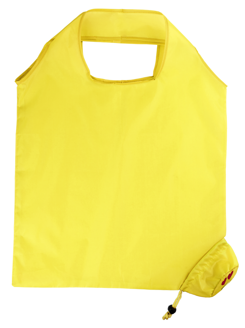Bolsa plegable de divertidos diseños emoji en llamativo color amarillo. De suave poliéster 190T y con cordón a juego con accesorio de ajuste.