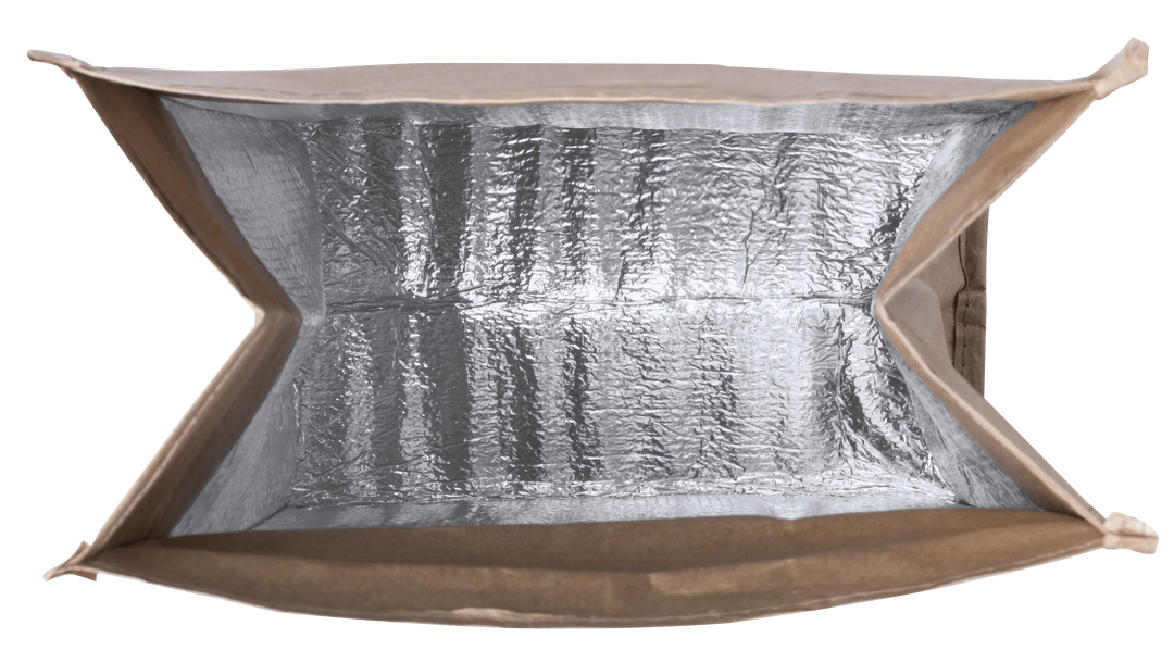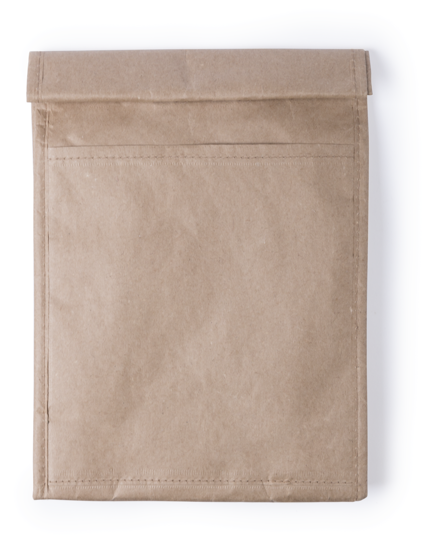 Bolsa térmica en papel resistente a la humedad de 85g/m2. Con interior isotermo acabado en aluminio, bolsillo exterior y cierre de velcro. 2,3 litros de capacidad.