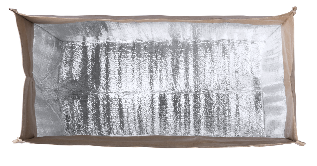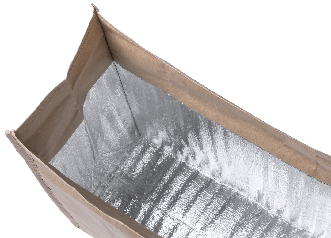 Bolsa térmica en papel resistente a la humedad de 85g/m2. Con interior isotermo acabado en aluminio, y cierre de velcro. 2,6 litros de capacidad.