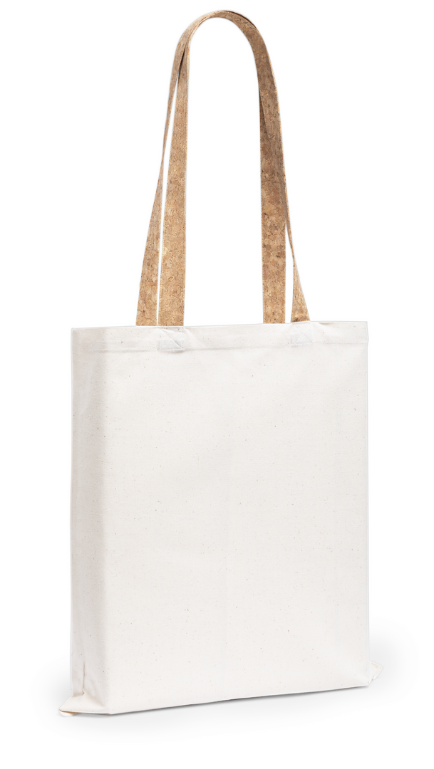 Bolsa de línea nature en resistente algodón de 180g/m2 y originales asas en corcho natural de 70cm reforzadas. Acabado cosido y resistencia hasta 8kg de peso.