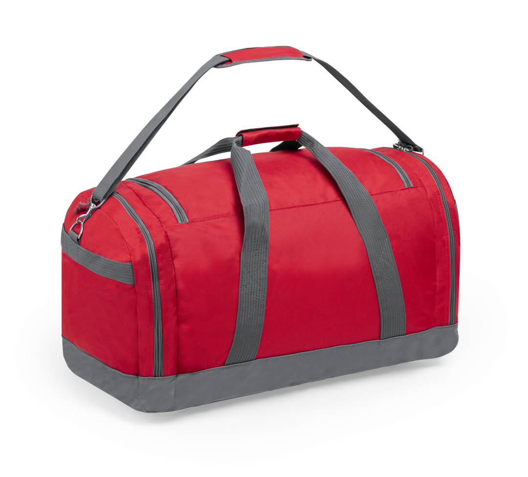 Bolso multiusos de gran capacidad en resistente poliéster 600D. De diseño bicolor, con base y detalles en color gris. Compartimento principal y bolsillos laterales con cierre de cremallera. Resistentes asas de transporte en nylon, con cierre de velcro a j