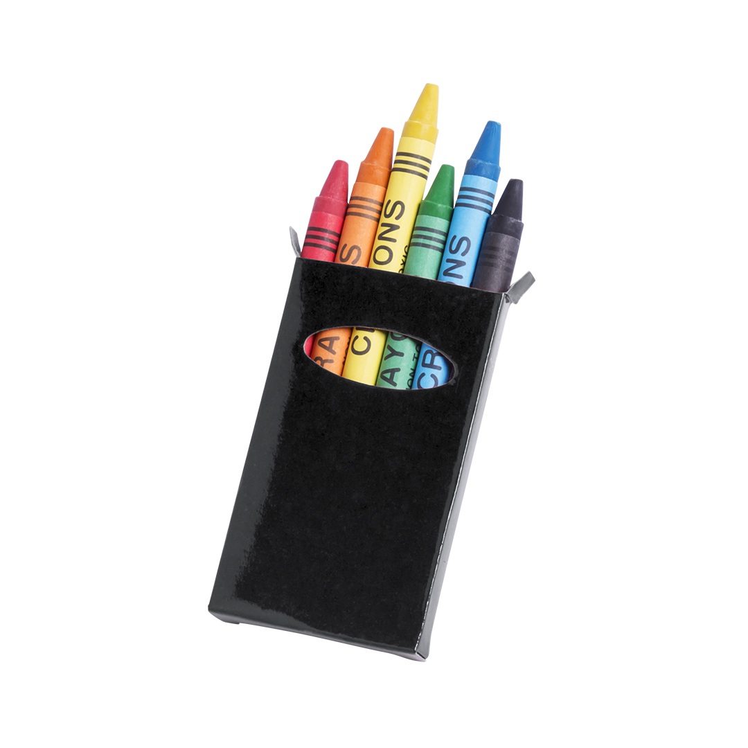 Set de 6 ceras en caja de cartón con acabado brillante en vivos colores y ventana. Con cuerpo cilíndrico en variados colores. En colores rojo, verde, amarillo, azul, negro, y naranja. 6 Ceras