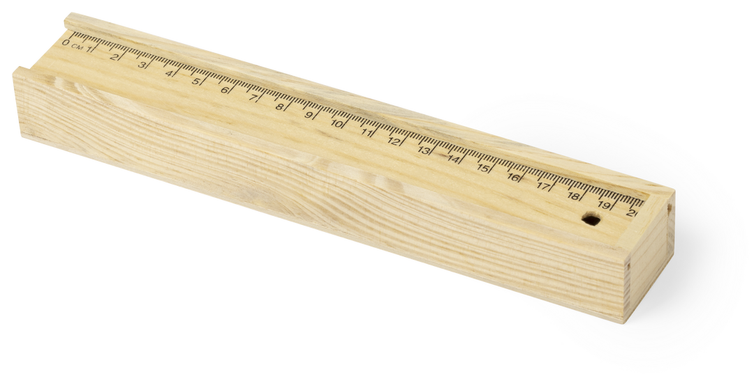 Set de 6 lápices en estuche de madera natural. Lápices en madera, con cuerpo redondo de acabado natural y minas en colores variada gama de vivos colores. Tapa de cierre anti deslizante con regla integrada de 20cm. 6 Lápices