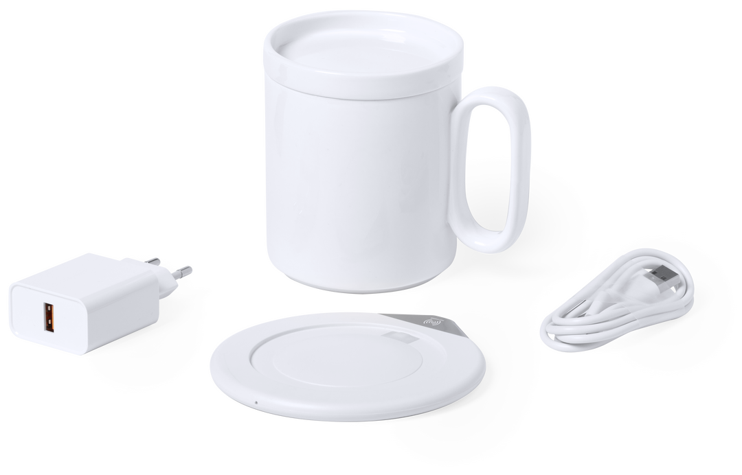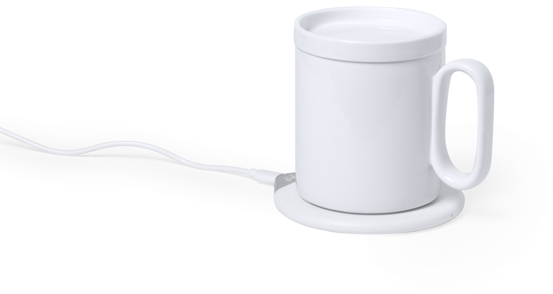 Calentador de tazas con cargador inalámbrico integrado de carga rápida -10W-. Con taza de cerámica de 350 ml, especialmente diseñada para calentar y mantener la temperatura de la bebida, con tapa a juego. Incluye cargador de pared y cable de carga Tipo C. 350 ml. Inalámbrico. Carga Rápida 10W. Conexión USB. Cable Incluido