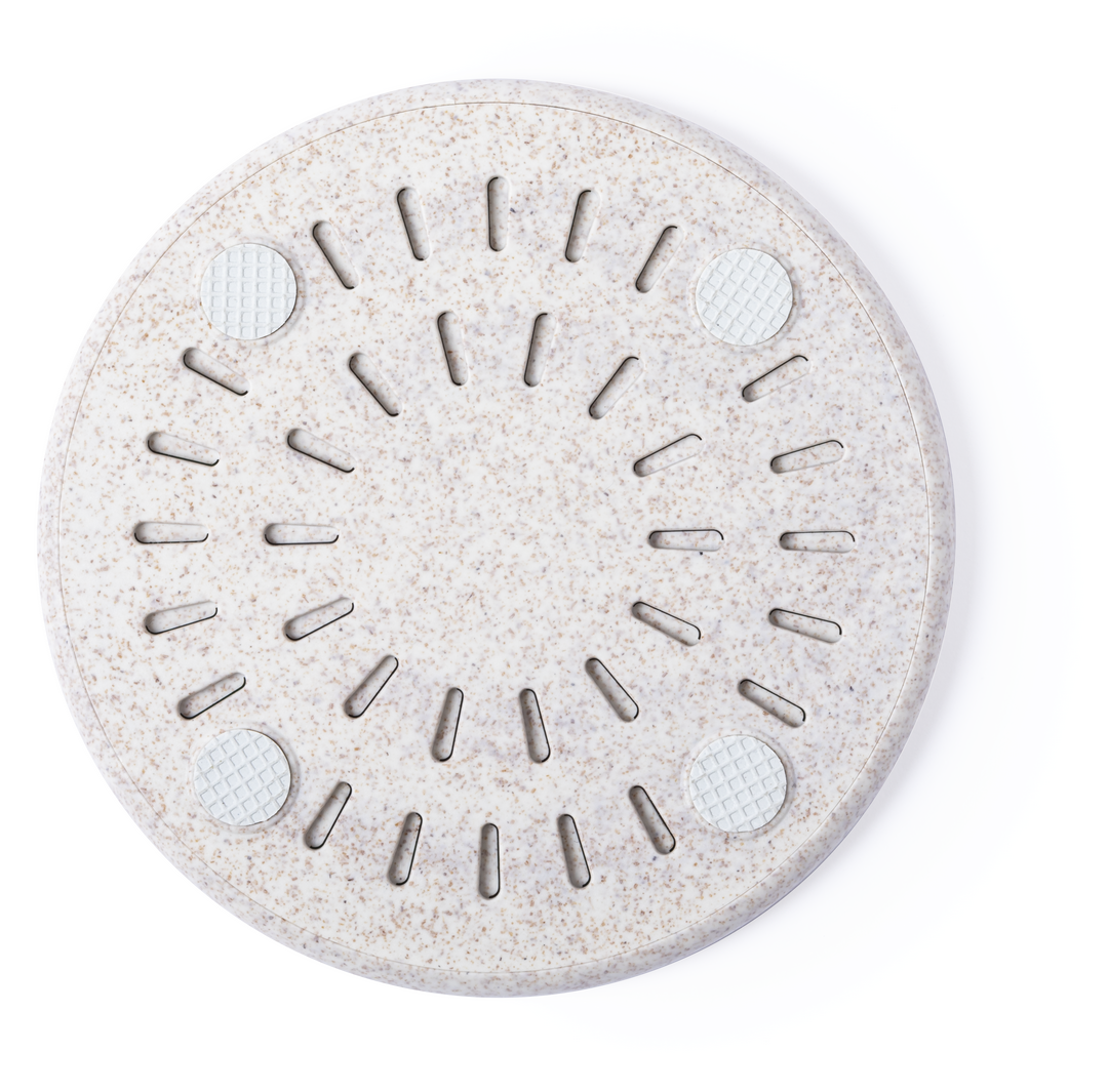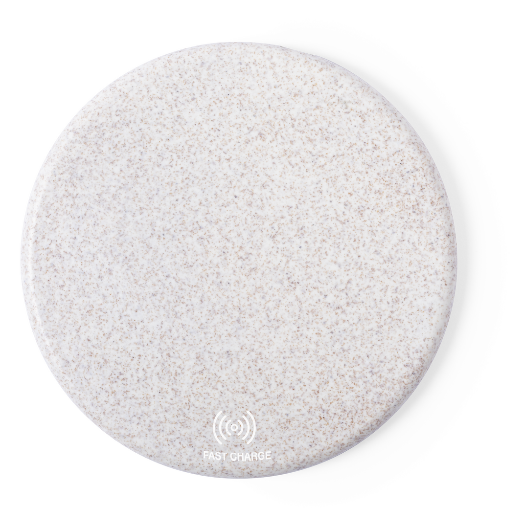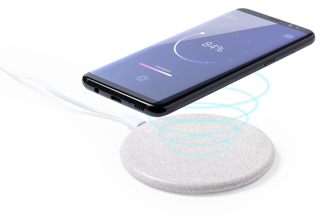 Cargador inalámbrico de diseño circular fabricado en caña de trigo, para así fomentar la utilización de materias primas naturales y reducir las emisiones contaminantes. Con función carga rápida de 10W e indicador led. Cable de carga micro USB incluido y Inalámbrico. Carga Rápida 10W. Cable Incluido