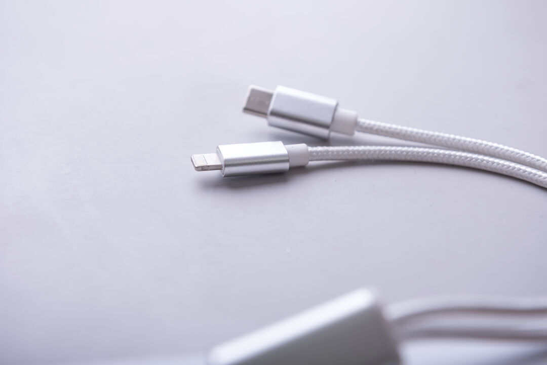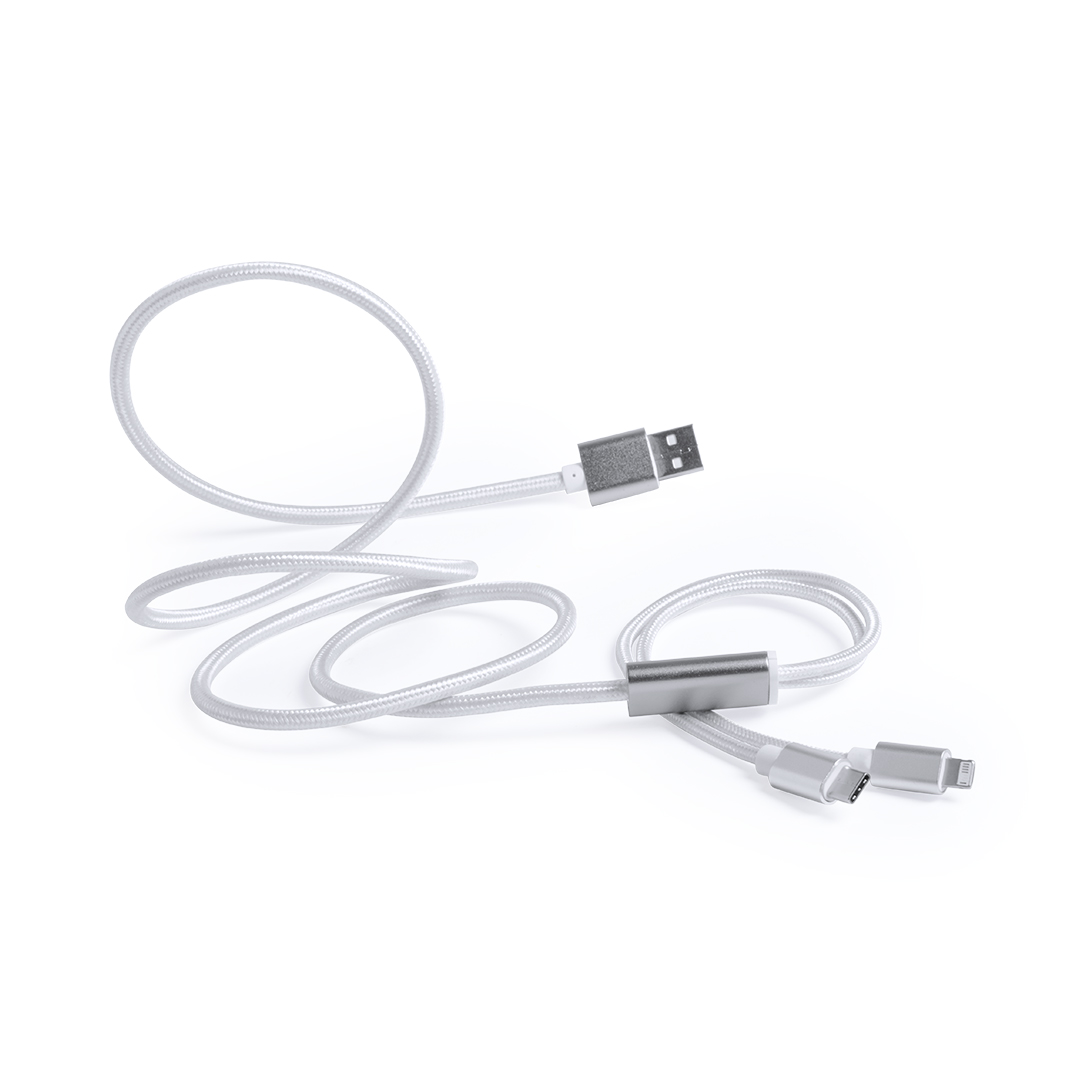 Cable cargador Tipo-C y con conexión dual micro USB/Lightning. De 120cm de longitud, con conectores de aluminio y chapa central para marcaje. Conexión Micro USB, Tipo C y Lightning