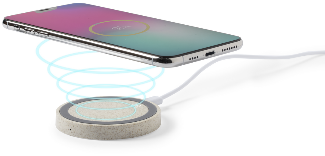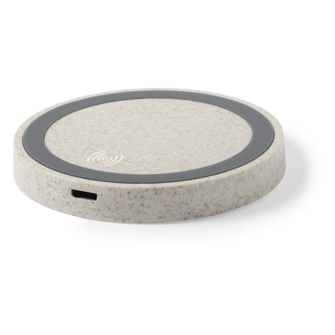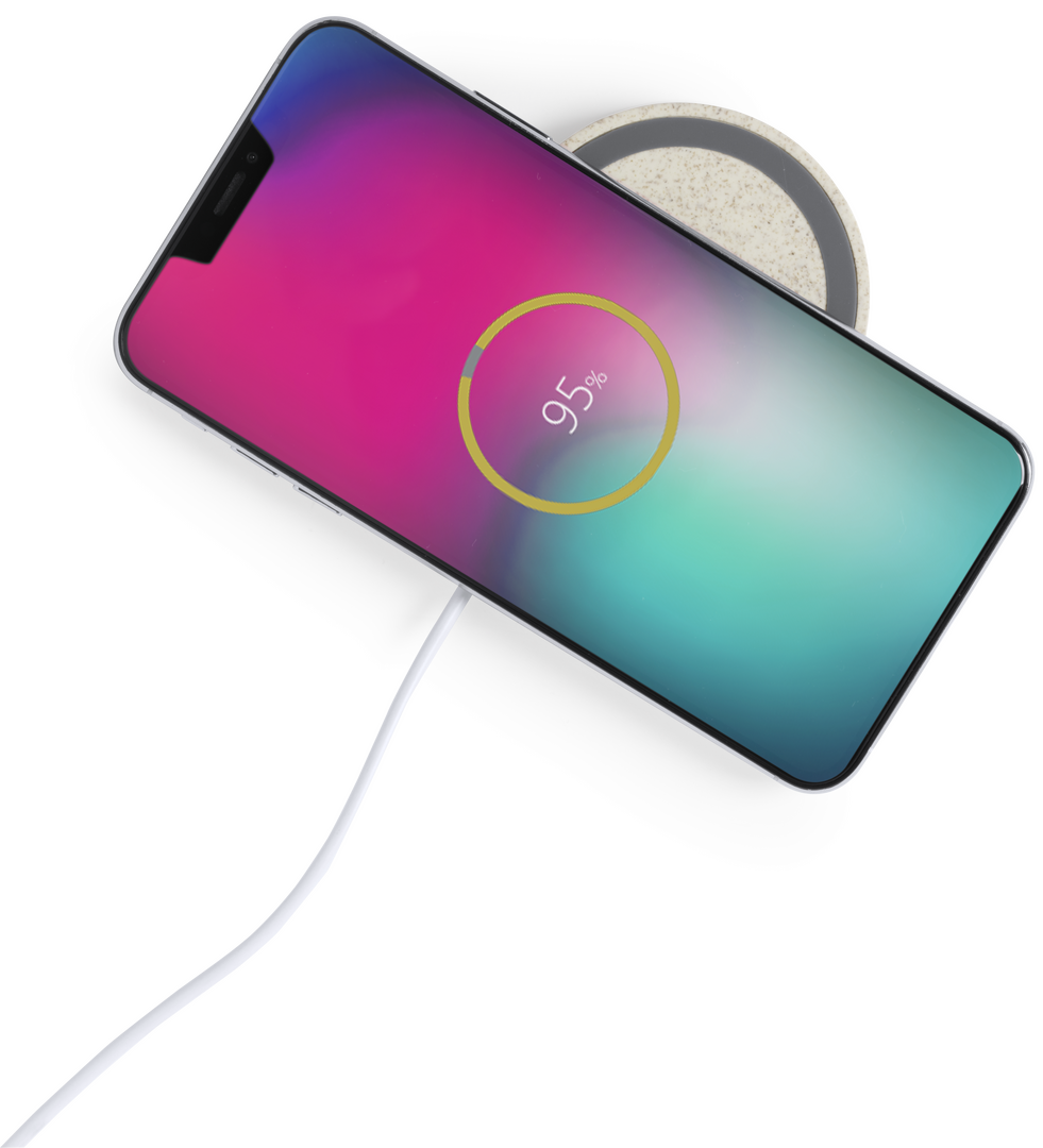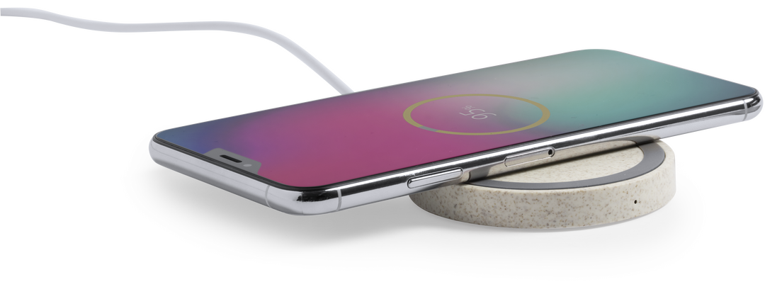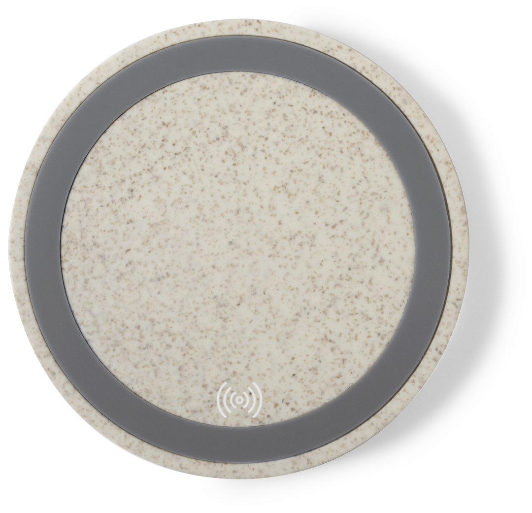 Cargador inalámbrico circular de línea nature. Carcasa en caña de trigo, para así fomentar la utilización de materias primas naturales y reducir las emisiones contaminantes. Con base antideslizante e indicador LED de estado de carga. Compatible con smartp Inalámbrico. Cable Incluido