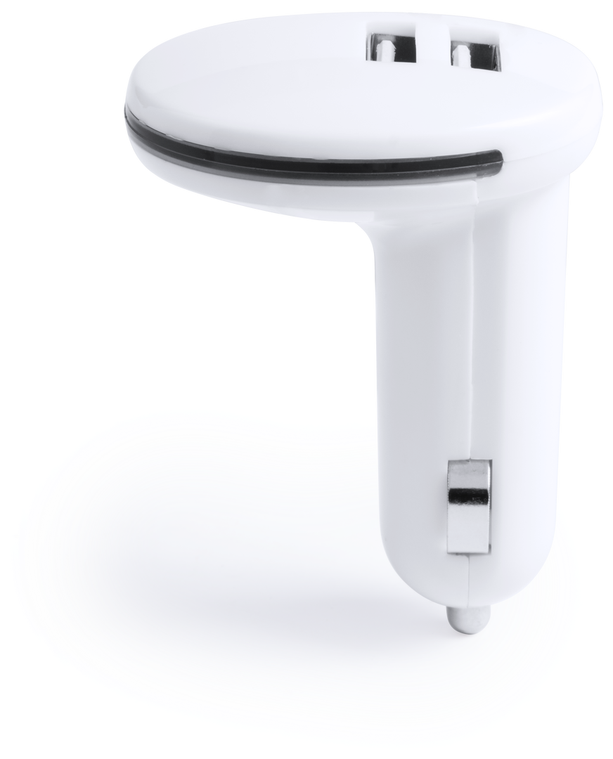 Cargador USB de para mechero de coche de 2.100 mA de capacidad de carga en diseño minimalista de color blanco. Con salida USB dual que permite la carga simultánea de dos dispositivos móviles. Presentado en caja individual. 2 Salidas USB. 2100 mA