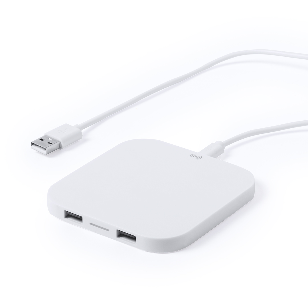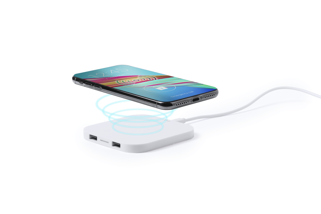 Cargador inalámbrico de diseño minimalista en color blanco. Con salida USB dual extra de 2.100 mA de capacidad para carga simultánea de dos dispositivos. Con base antideslizante. Compatible con dispositivos equipados con tecnología de carga inalámbrica y Inalámbrico. 2 Salidas USB. 2100 mA. Cable Incluido
