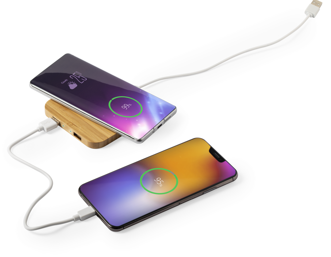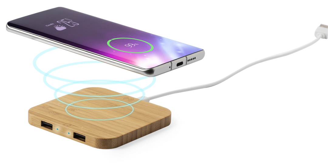 Cargador inalámbrico de línea nature. Carcasa en bambú procedente de cortes naturales. con salida USB dual de 2.100 mA de capacidad para carga simultánea de hasta 3 dispositivos (1 por carga inalámbrica y 2 por cable). Con base antideslizante y compatibl Inalámbrico. 2 Salidas USB. 2100 mA. Cable Incluido