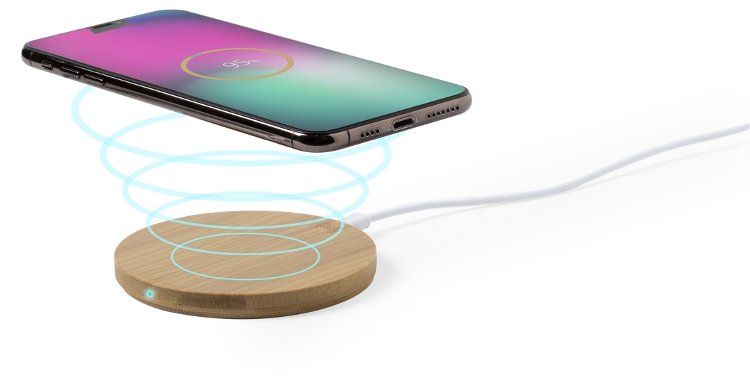 Cargador inalámbrico de línea nature y diseño circular. Carcasa en bambú procedente de cortes naturales. Indicador de estado de carga y compatible con dispositivos equipados con tecnología de carga inalámbrica. Amplia superficie de marcaje y presentado en Inalámbrico. Cable Incluido