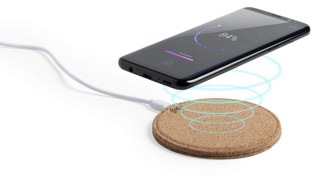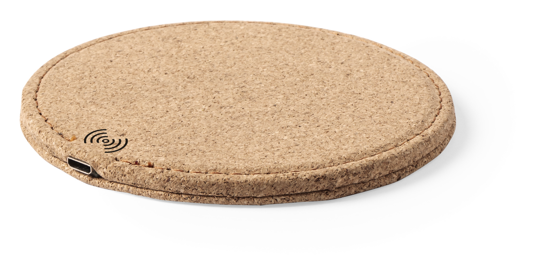 Cargador inalámbrico de línea nature y diseño circular fabricado en corcho natural, cuyos procesos de extracción tienen un mínimo impacto sobre el medio ambiente, destacando además por ser uno de los materiales orgánicos con más durabilidad y resistencia. Inalámbrico. Cable Incluido