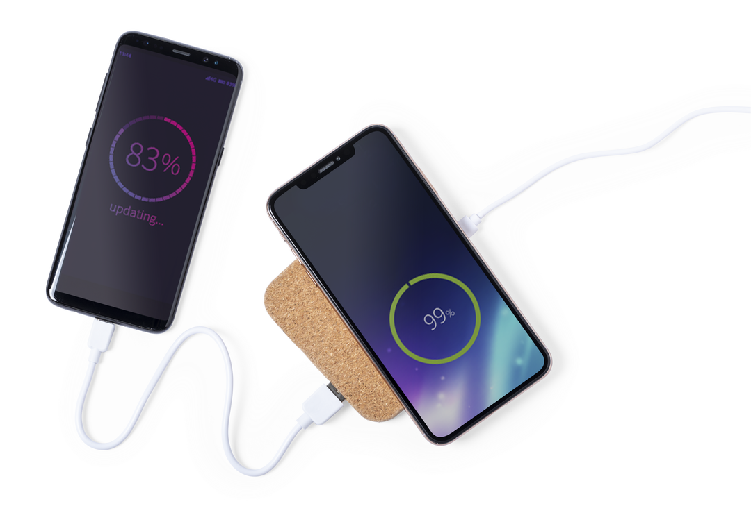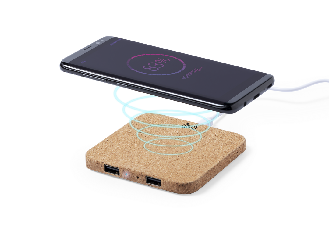 Cargador inalámbrico 5W de línea nature. Carcasa en corcho natural, con indicador de estado de carga y salida USB dual de 2.100 mA de capacidad para carga simultánea de hasta 3 dispositivos (1 por carga inalámbrica y 2 por cable). Incluye cable micro USB Inalámbrico. 2 Salidas USB. 2100 mA. Cable Incluido