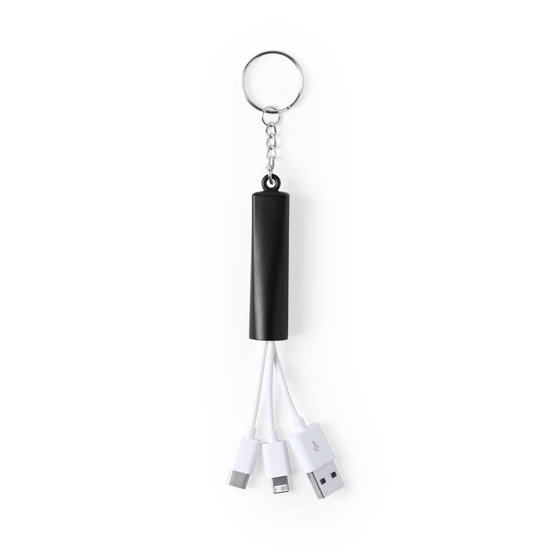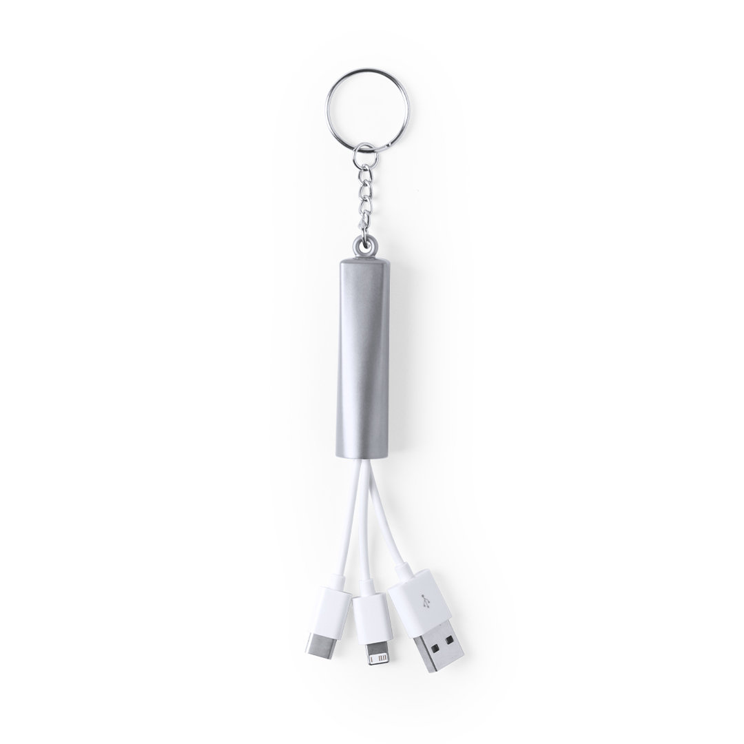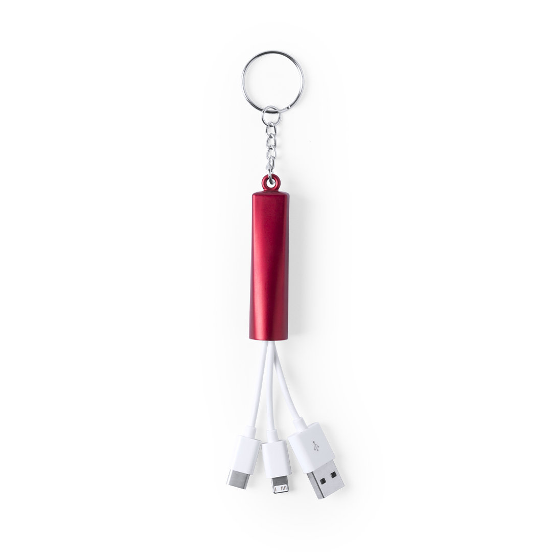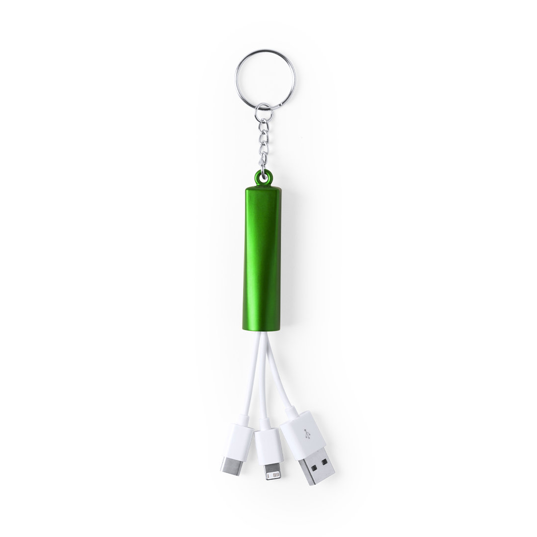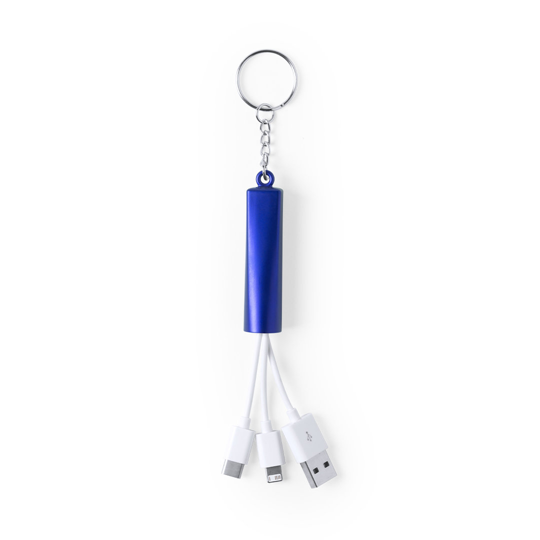 Llavero con cargador integrado en variada gama de colores metalizados. Con luz led de estado de carga y conexiones Tipo C, Micro USB y Ligthning. Luces Led. Conexión Micro USB, Tipo C y Lightning