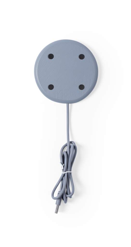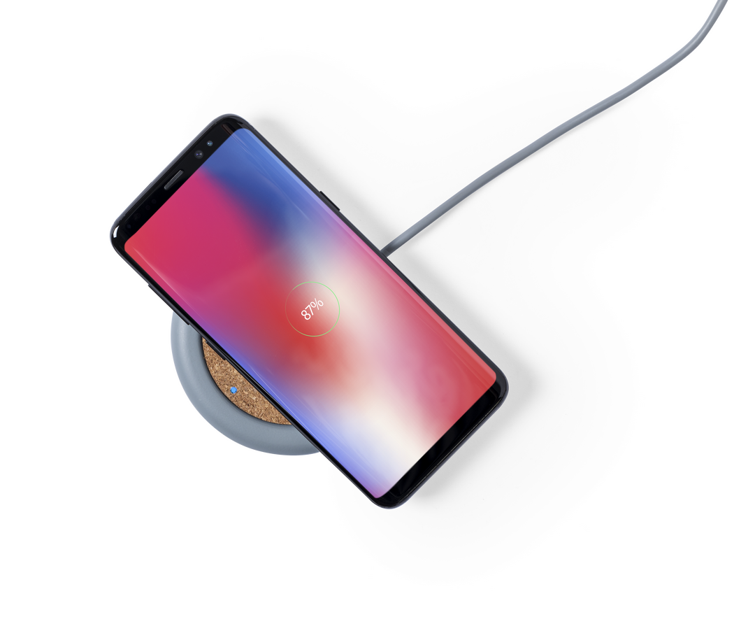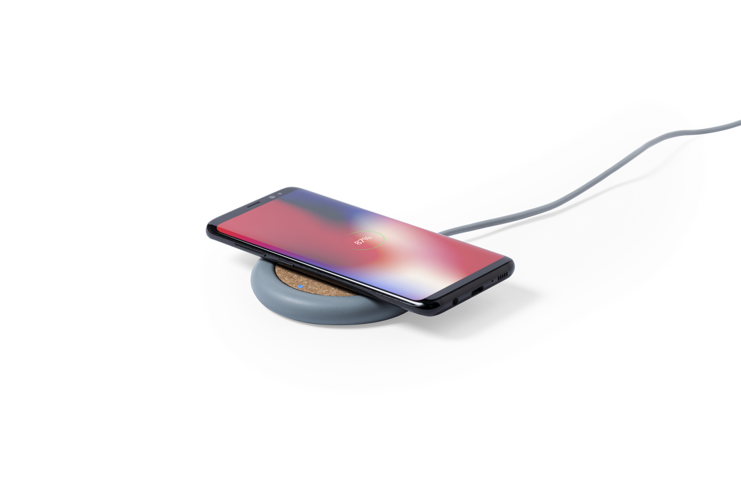 Cargador inalámbrico 5W de línea nature y diseño circular, en combinación de corcho natural y cemento de piedra caliza, un conglomerante formado por la mezcla de materiales naturales, principalmente piedra caliza molida y agua, obteniendo un material de g Inalámbrico. Cable Incluido