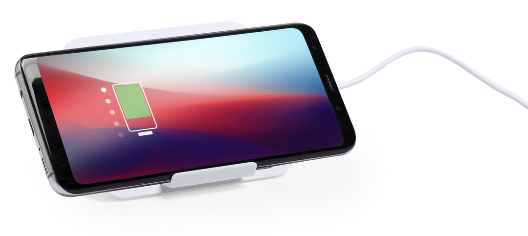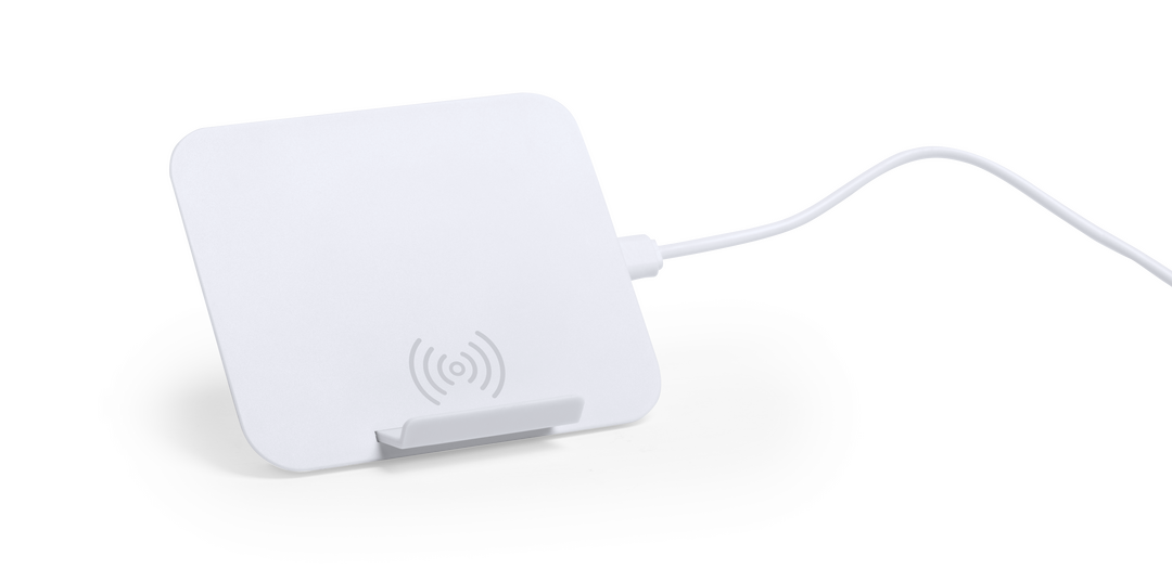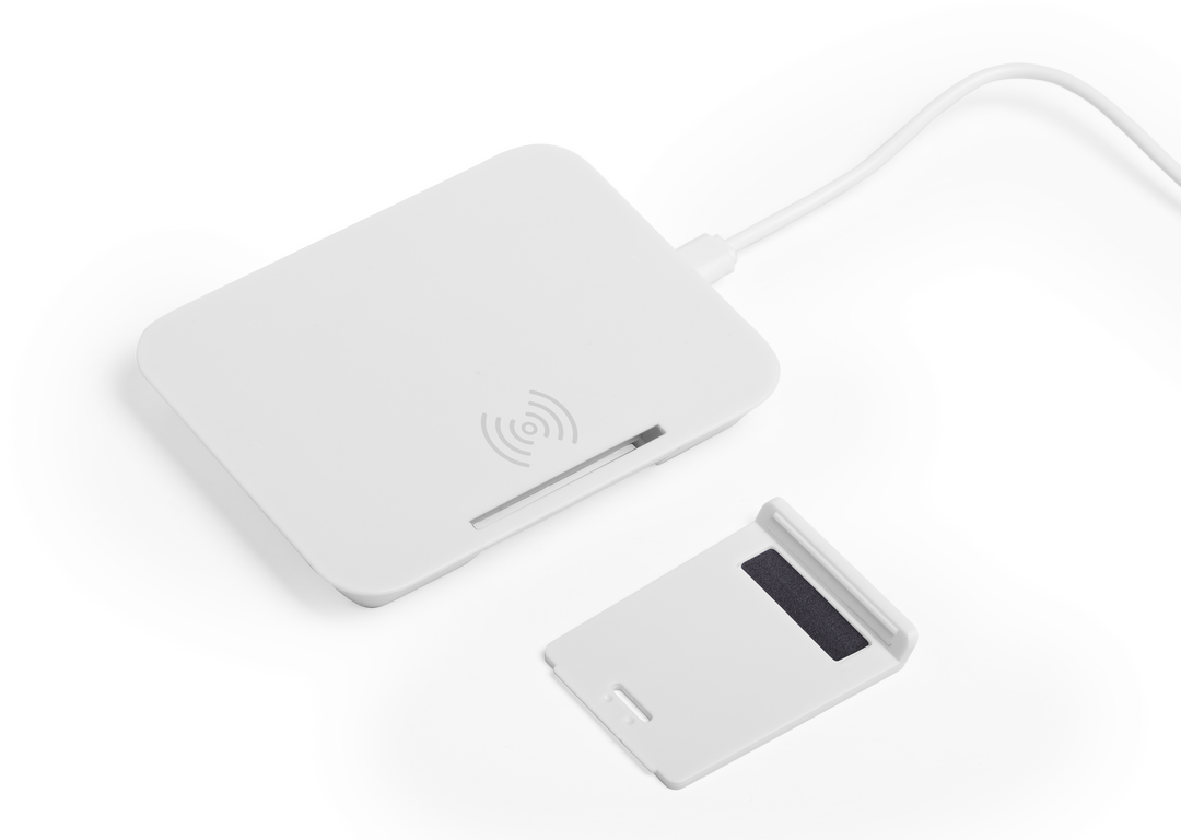 Cargador inalámbrico con función soporte de smartphone. De sobrio diseño monocolor en blanco, con cable de carga micro USB incluido. Compatible con dispositivos equipados con tecnología de carga inalámbrica. Presentado en atractiva caja de diseño. Inalámbrico. Cable Incluido
