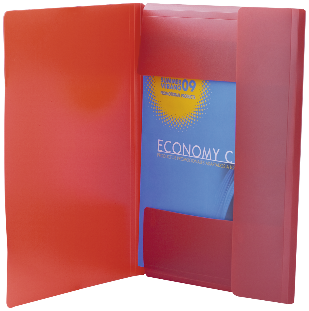 Carpeta de gran capacidad con cierre elástico, en variados colores, de acabado translúcido y sistema de plegado tripe.