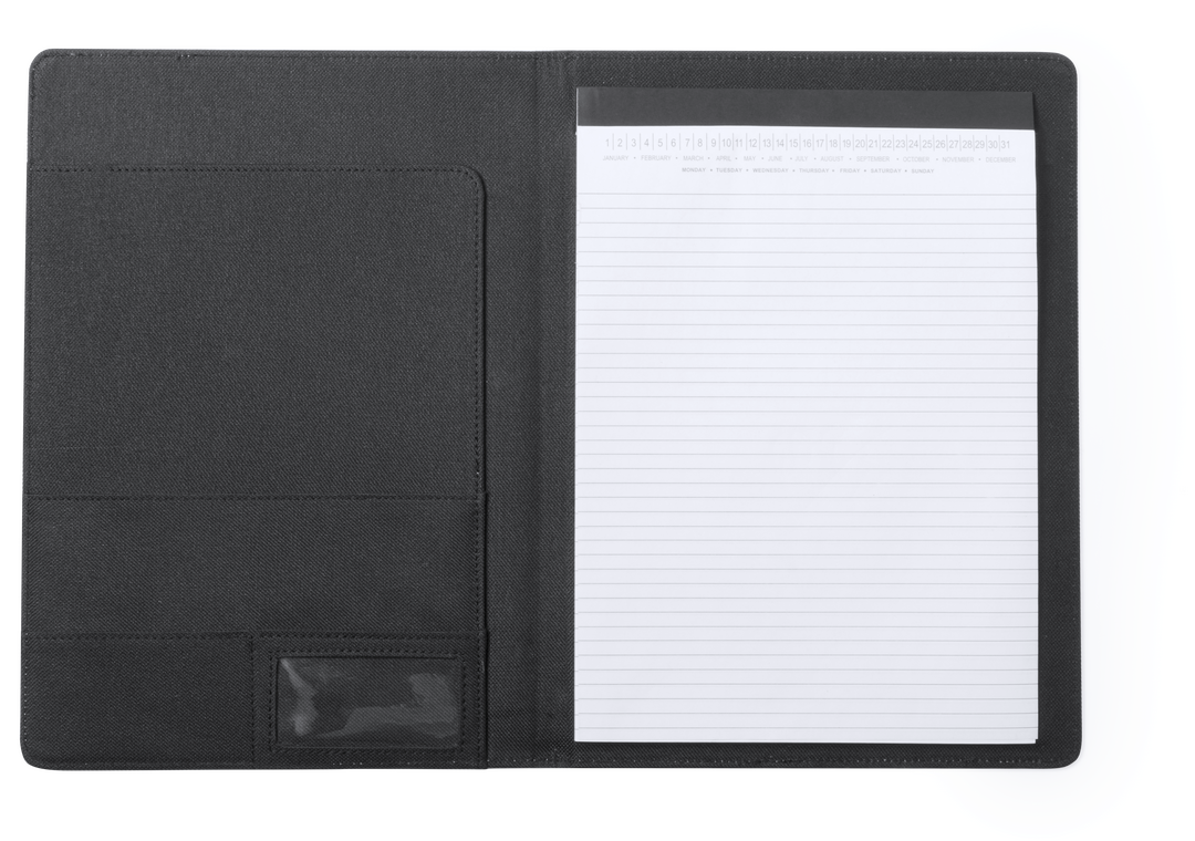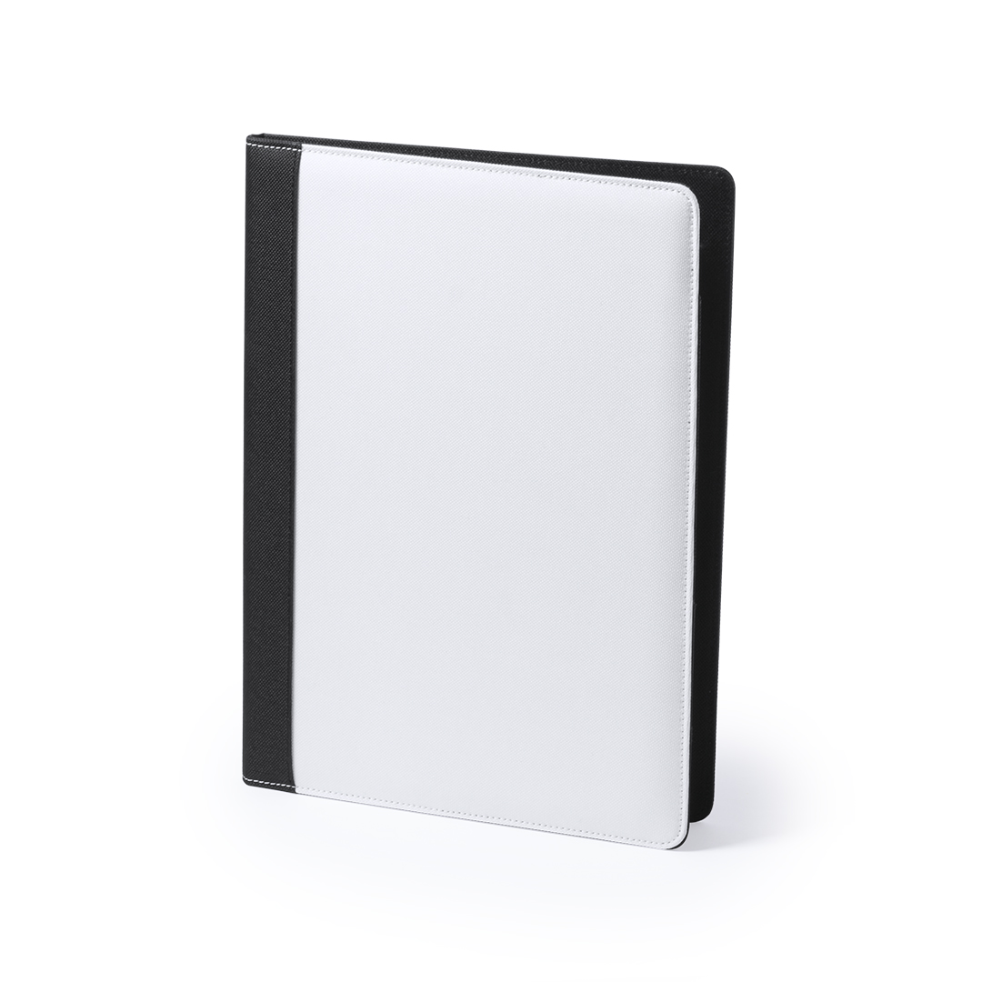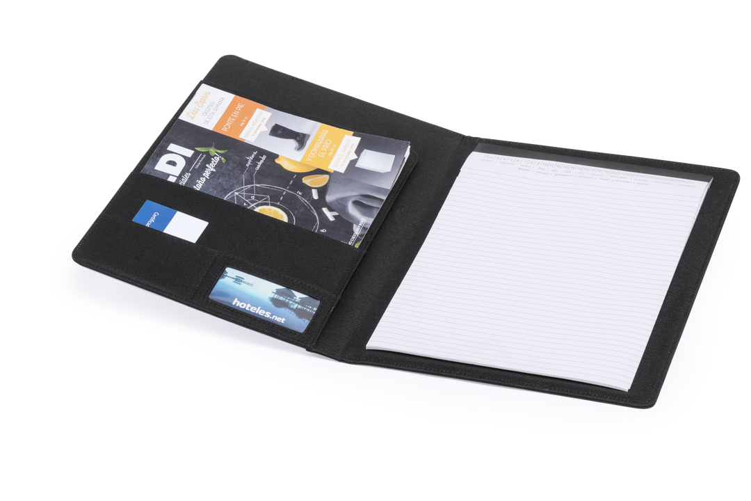Carpeta con tapas acolchadas en suave y resistente poliéster 600D especialmente diseñado para marcaje en sublimación. Con bolsillos interiores, tarjeteros y bloc de 20 hojas lisas. Bloc 20 Hojas