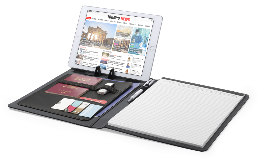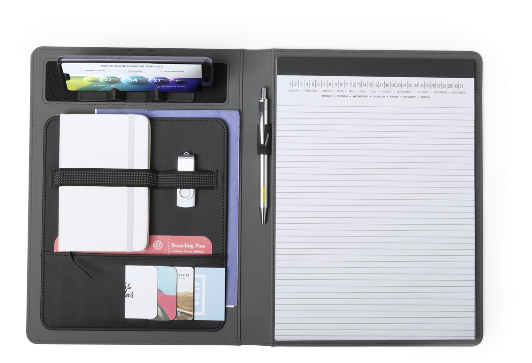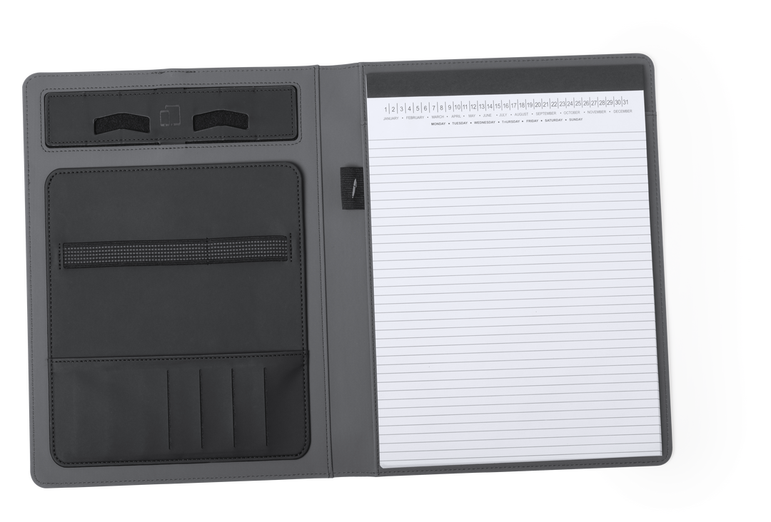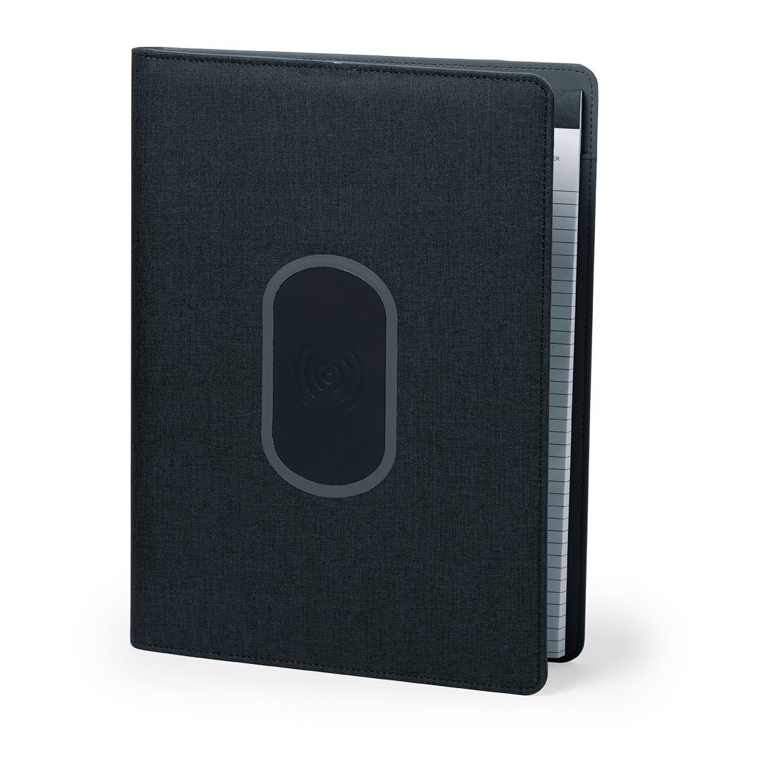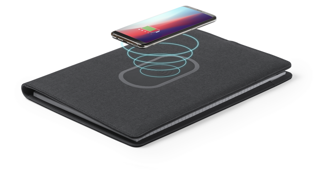 Carpeta con base de carga inalámbrica. En suave polipiel y poliéster 300D de acabado grafito, de sobrio diseño y con base de carga inalámbrica en portada, multitud de compartimentos para almacenar tarjetas de visita y memorias USB, además de un soporte pa Inalámbrico. Bloc 40 Hojas. Cable Incluido