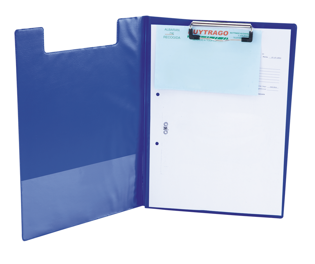 Clásica carpeta de pinza en variados colores y acabado en suave PVC. Con bolsillo transparente de solapa interior en resistente PVC.