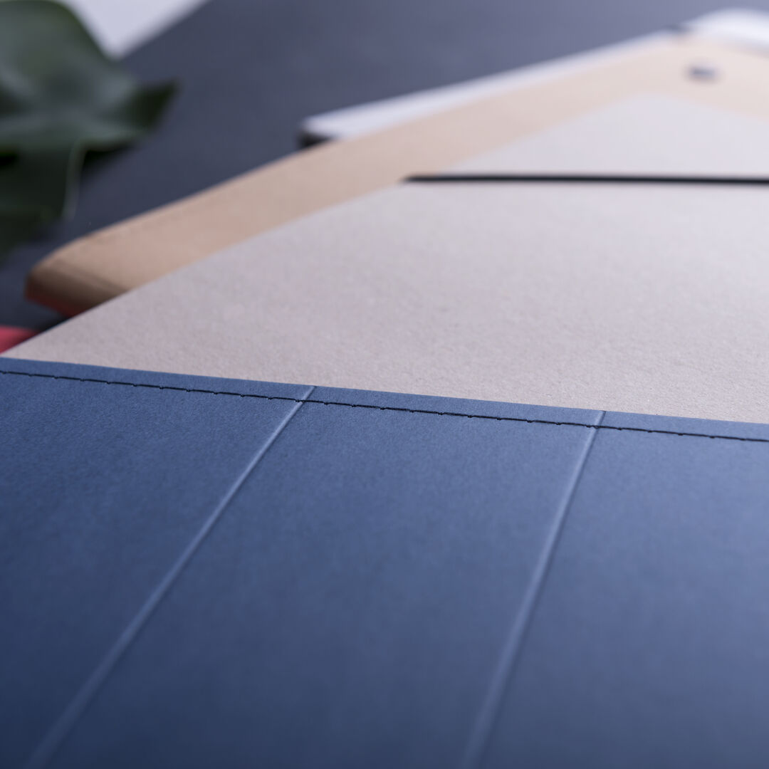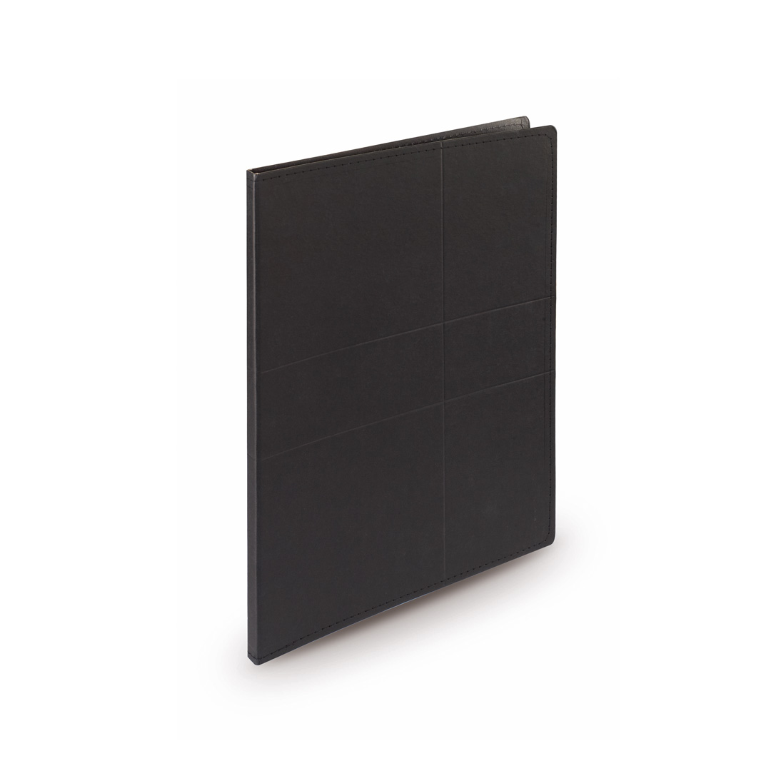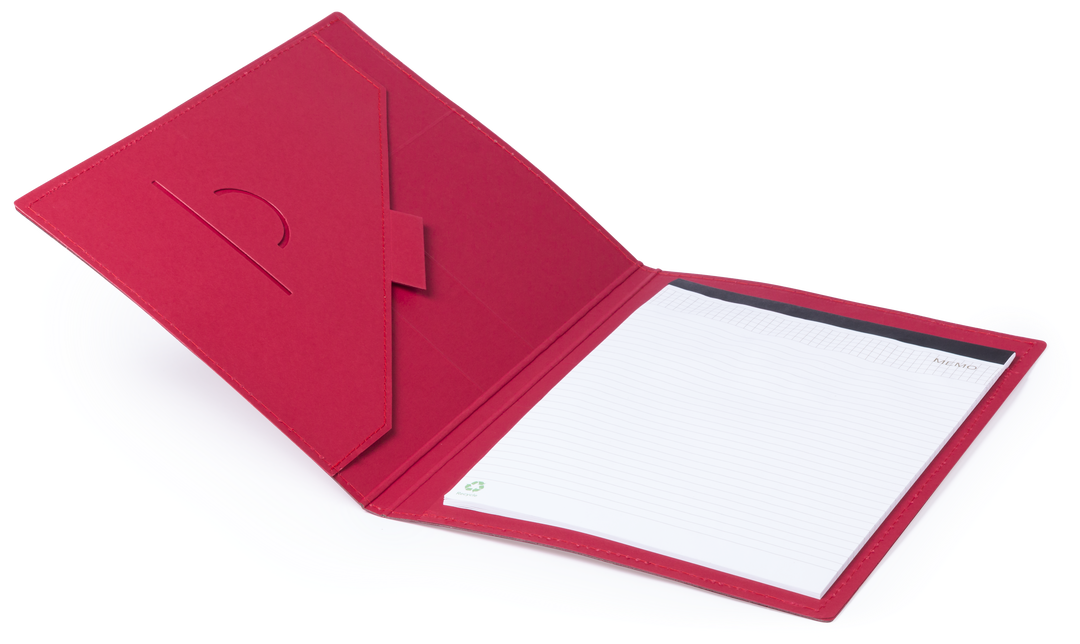 Carpeta en resistente cartón reciclado de acabado rígido con costuras de refuerzo y en variados colores. Interior con bloc extraíble de 25 hojas con distribución a una raya, bolsillo de solapa, tarjeteros y soporte para bolígrafo. Bloc 25 Hojas