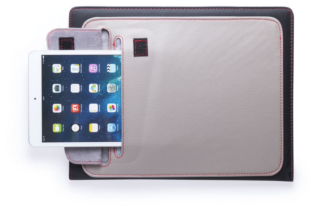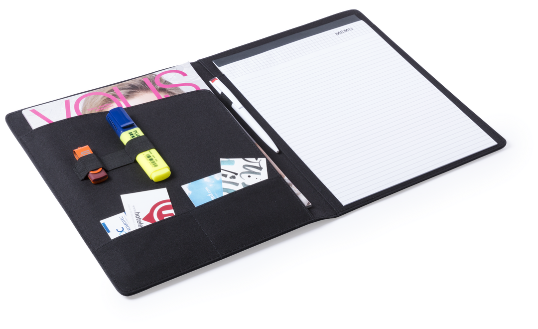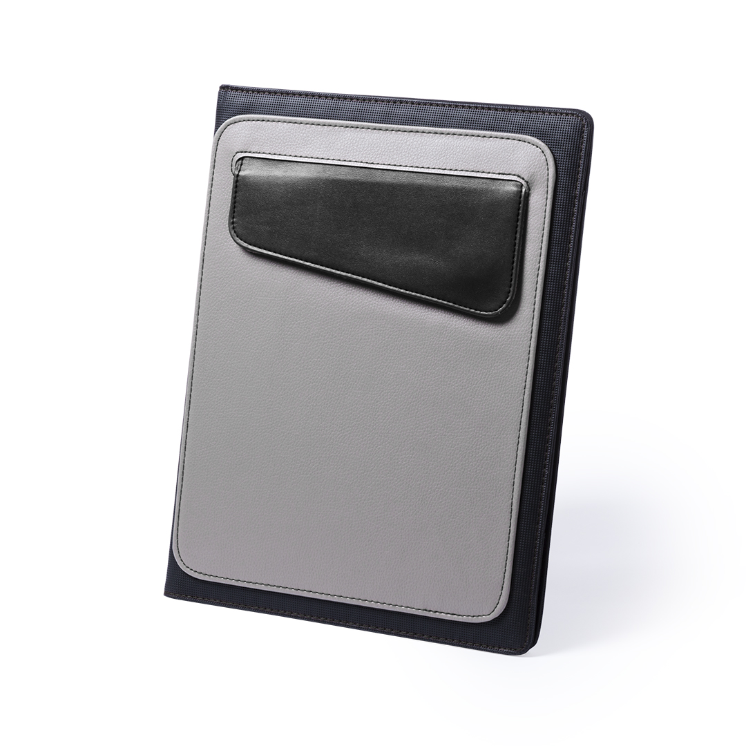 Funda carpeta de acabado en original combinación de polipiel y poliéster 300D. Compartimento interior para tablets de hasta 10 pulgadas. Con funda en parte frontal con original solapa de color y costuras a juego. Interior con bloc de notas de 20 hojas con Bloc 20 Hojas