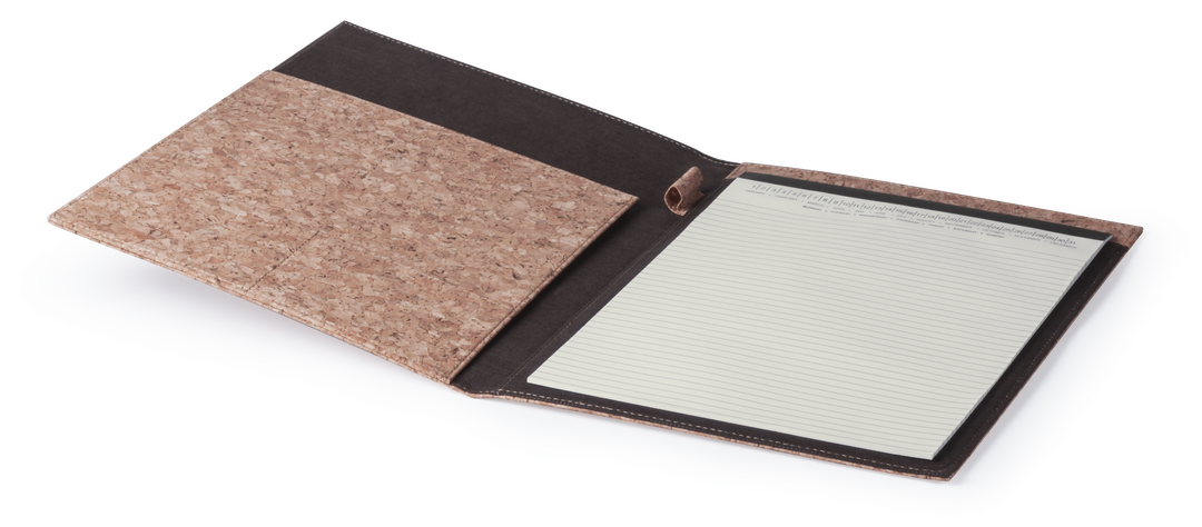 Carpeta con tapas de suave tacto acabadas en corcho natural y con interior en suave polipiel. Con bolsillo interior acabado en corcho, bloc de notas con 20 hojas de distribución a una raya y soporte para bolígrafo. Bloc 20 Hojas