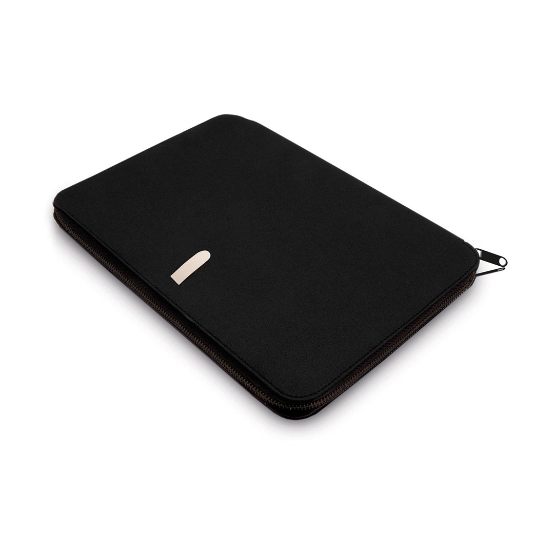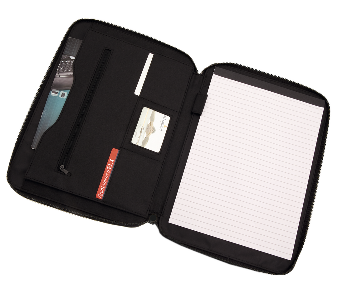 Elegante portadocumentos de cierre de cremallera acabado en suave microfibra. Interior con bloc extraíble de 20 hojas de distribución a una raya, bosillo de cremallera, bolsillo solapa, tarjeteros y soporte para bolígrafo. Con elegante chapa metálica en f Bloc 20 Hojas