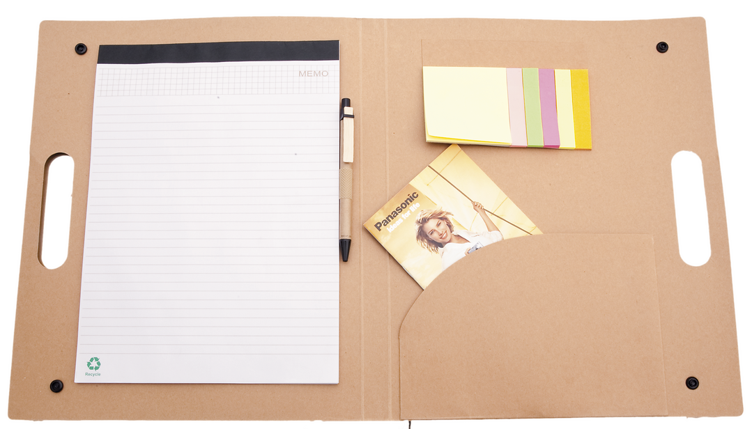 Carpeta ecológica con doble cierre de clic en cartón reciclado flexible y con cómodas asas integradas. Interior con bloc extraíble de 25 hojas con distribución a una raya, 25 notas adhesivas grandes, 125 mininotas adhesivas, bolsillo de solapa y soporte p Bloc 20 Hojas. 25 Notas Adhesivas 7,4 x 7,4 cm. 125 Mininotas Adhesivas 1,5 x 7,5 cm. Bolígrafo Cartón Reciclado Incluido