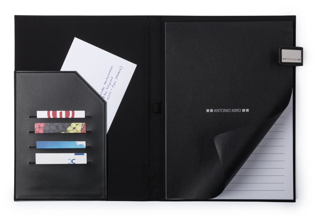 Carpeta de Antonio Miró en elegante combinación de nylon 1200D y suave polipiel. Con elegante cierre imantado con logotipo de la marca e interior con bolsillo de solapa, tarjeteros y bloc de notas de 50 hojas con distribución a una raya. Presentado en ele Bloc 50 Hojas