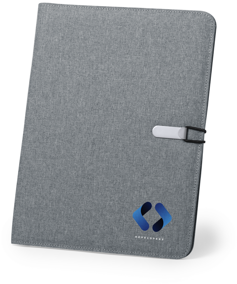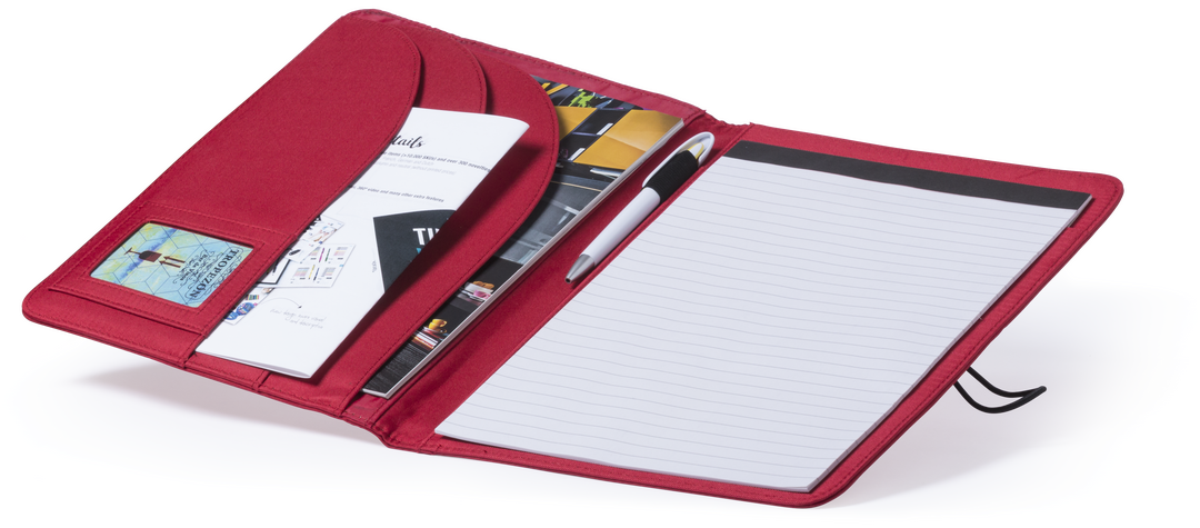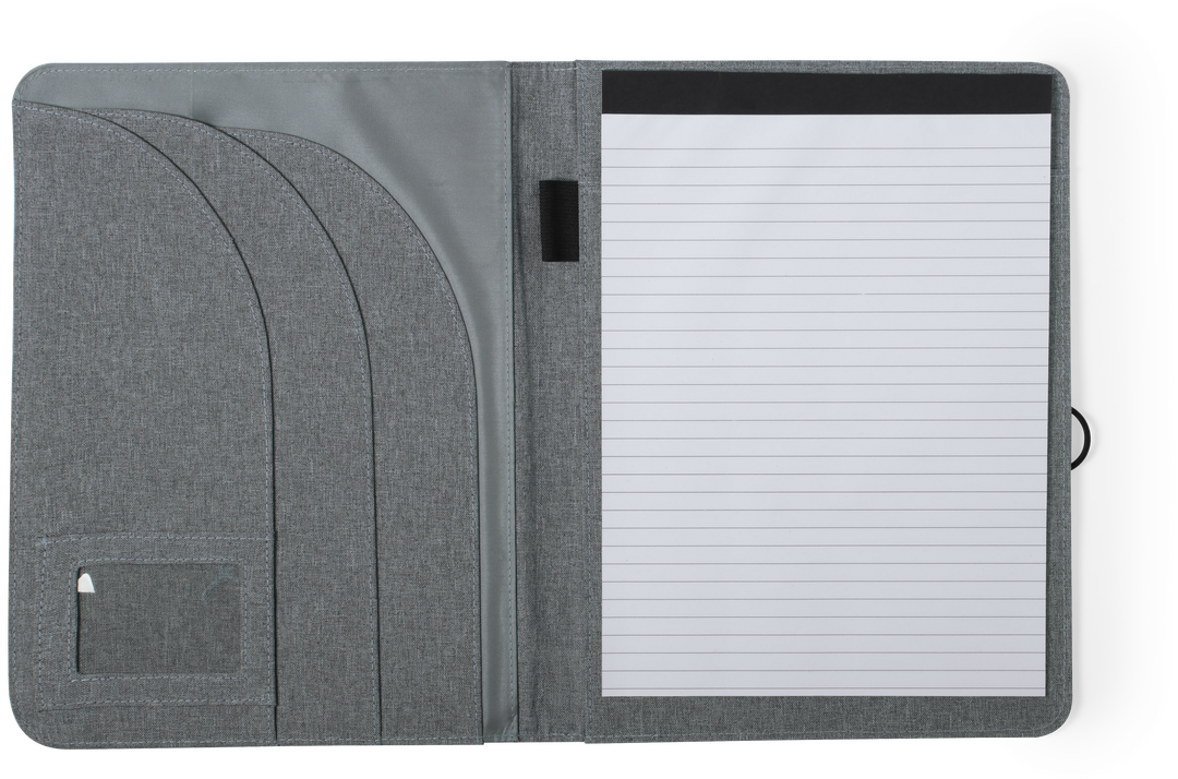 Elegante carpeta en vivos colores acabada en suave microfibra, con cierre metálico de elástico especialmente diseñado para marcaje en láser. Interior con bloc extraíble de 20 hojas lisas, 3 bolsillos de solapa, tarjeteros y soporte para bolígrafo. Bloc 20 Hojas