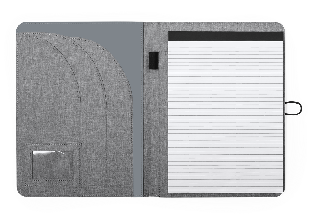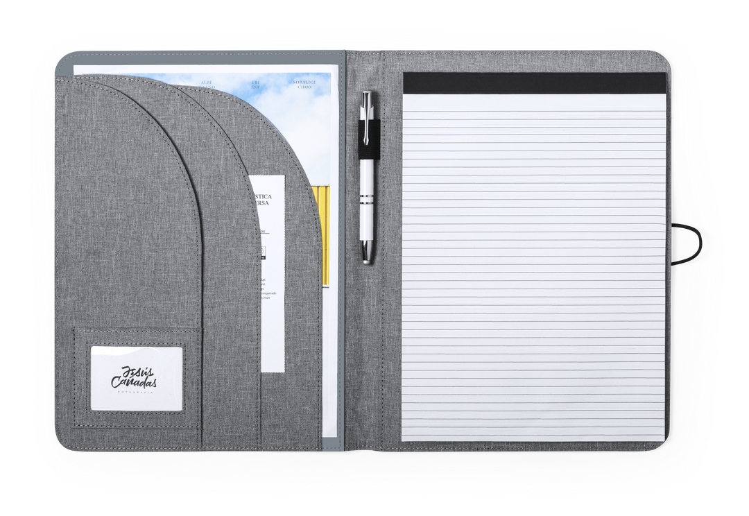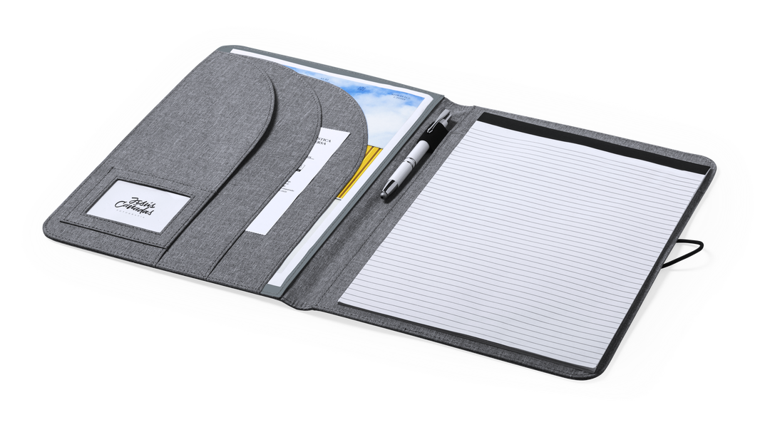 Elegante carpeta de línea nature tamaño A4. Fabricada en resistente 600D RPET efecto melange, elaborado a partir de plástico reciclado para así fomentar la reutilización de residuos plásticos y contribuir a la sostenibilidad del planeta. Detalles en negro Bloc 20 Hojas
