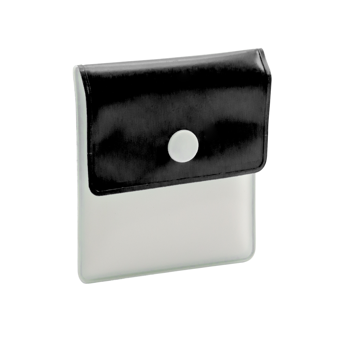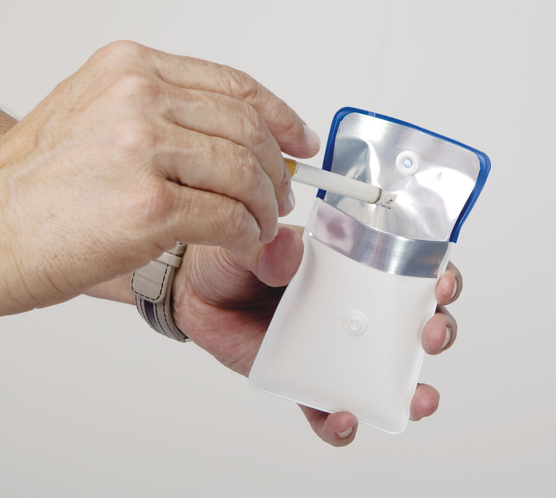 Cenicero de bolsillo con cuerpo en color blanco y solapa en vivos colores con cierre de corchete. Interior en aluminio ignífugo.