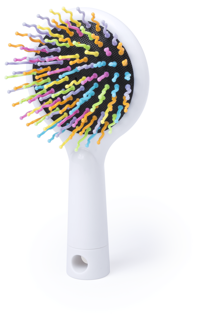 Original cepillo de púas multicolor con espejo integrado en parte trasera. Mango troquelado para colgar.