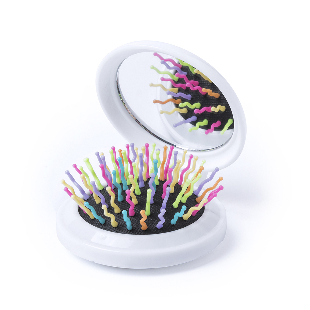 Original cepillo con espejo plegable en color blanco y con púas multicolor.