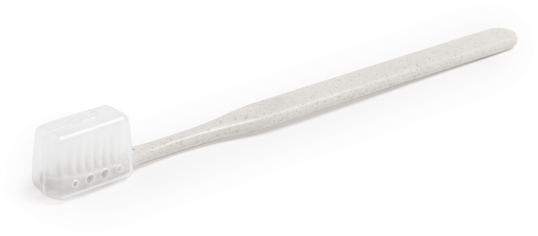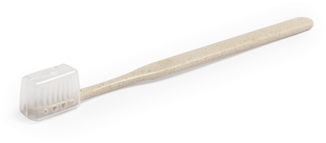 Cepillo de dientes de línea nature. Fabricado en caña de trigo, para así fomentar la utilización de materias primas naturales y reducir las emisiones contaminantes. Con capucha de protección.