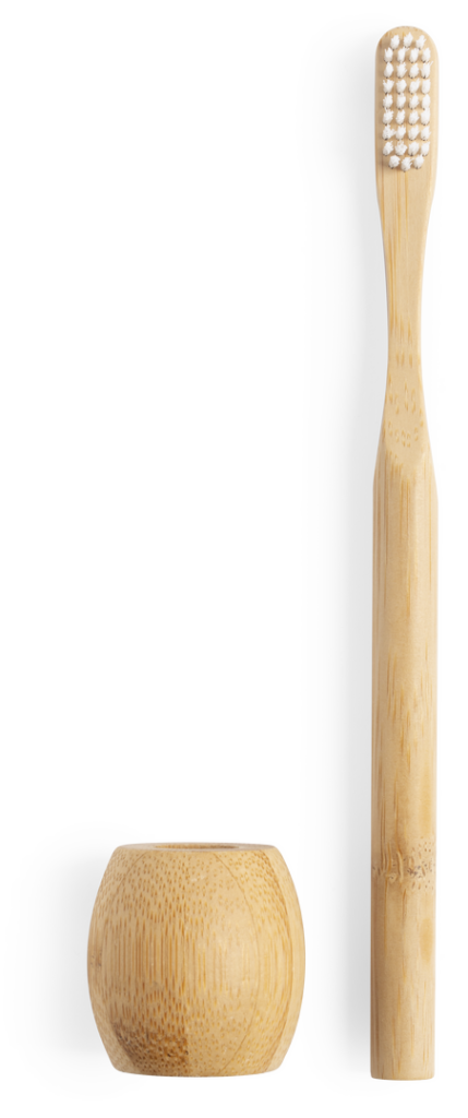 Cepillo de dientes de línea nature. Fabricado en bambú y con soporte en el mismo material. Presentado en caja individual de diseño eco.