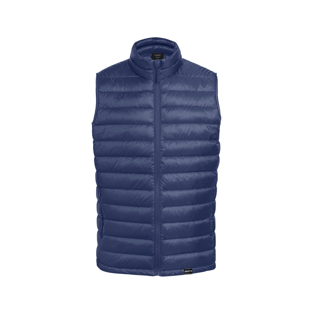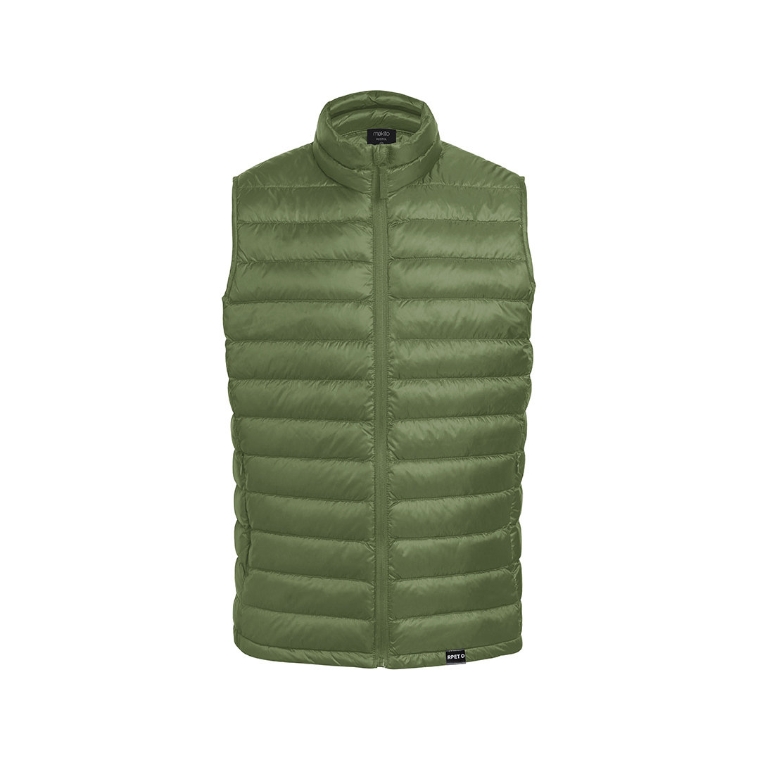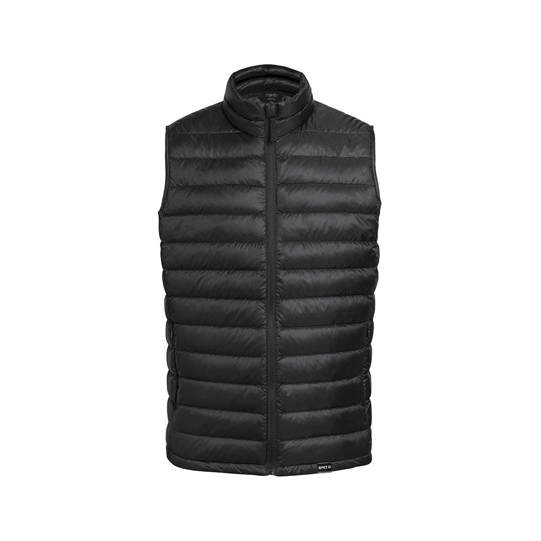 Chaleco unisex en cálido y suave material 100% poliéster RPET, elaborado a partir de plástico reciclado para así fomentar la reutilización de residuos plásticos y contribuir a la sostenibilidad del planeta. En material extra ligero efecto pluma, resiste Resistente al Viento y al Agua. Funda RPET Incluida