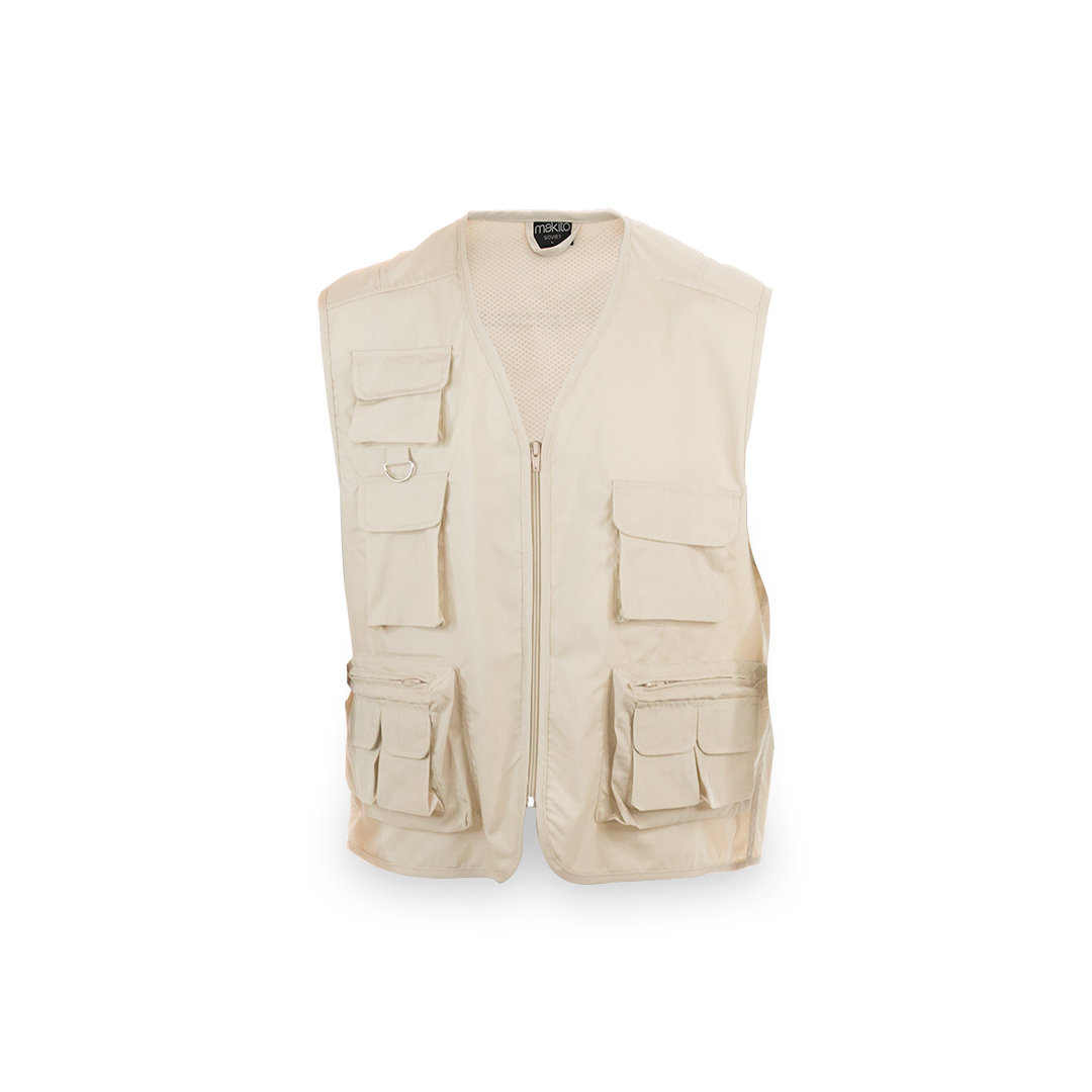 Chaleco en resistente combinación de materiales algodón y poliéster de vivos colores. Cierre de cremallera principal, multitud de bolsillos frontales y laterales de gran capacidad con cierre de velcro y anilla metálica en el pecho. Disponible en tallas L, Tallas: L, XL, XXL