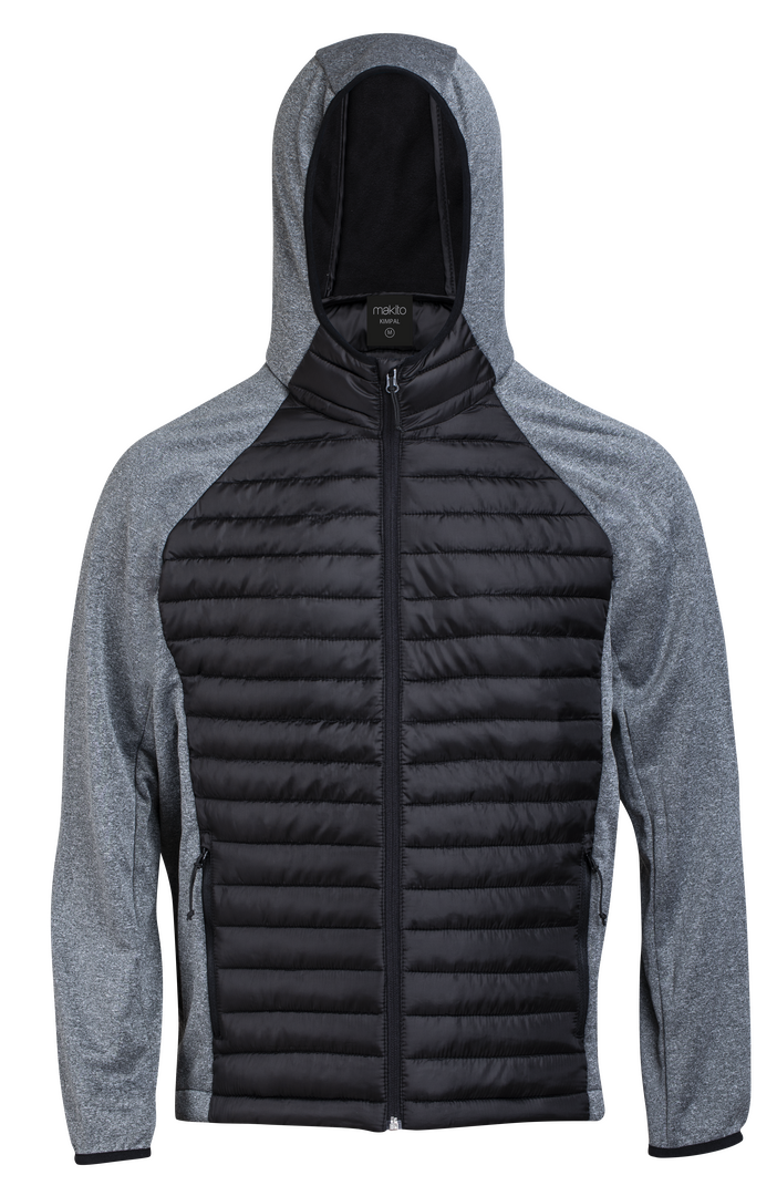 Chaqueta unisex transpirable en combinación de materiales soft shell y poliéster, con tejido acolchado tacto pluma en frontal y espalda. Capucha y manga estilo ranglán con ribete elástico en cuello, puños y bajo . De elegante construcción en combinación Resistente al Viento y al Agua