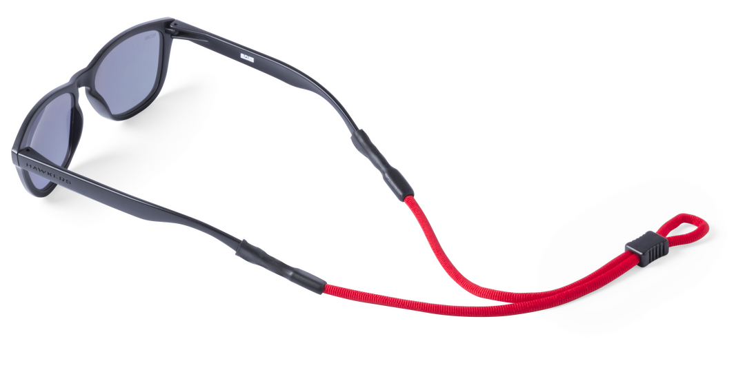 Original cinta para gafas con enganches de seguridad para todo tipo de patillas. En resistente poliéster de vivos colores. Accesorio de ajuste de seguridad con superficie lisa para marcaje.