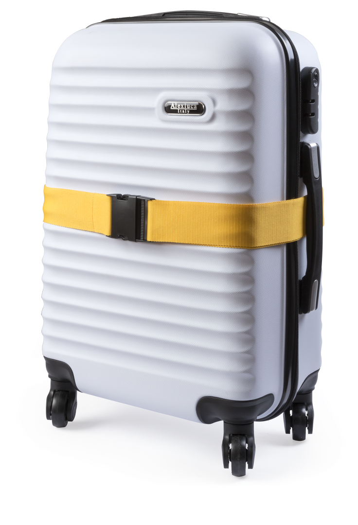 Cinta para maletas de 180cm en resistente poliéster de acabado en vivos colores. Con cierre de clic y accesorio de ajuste.