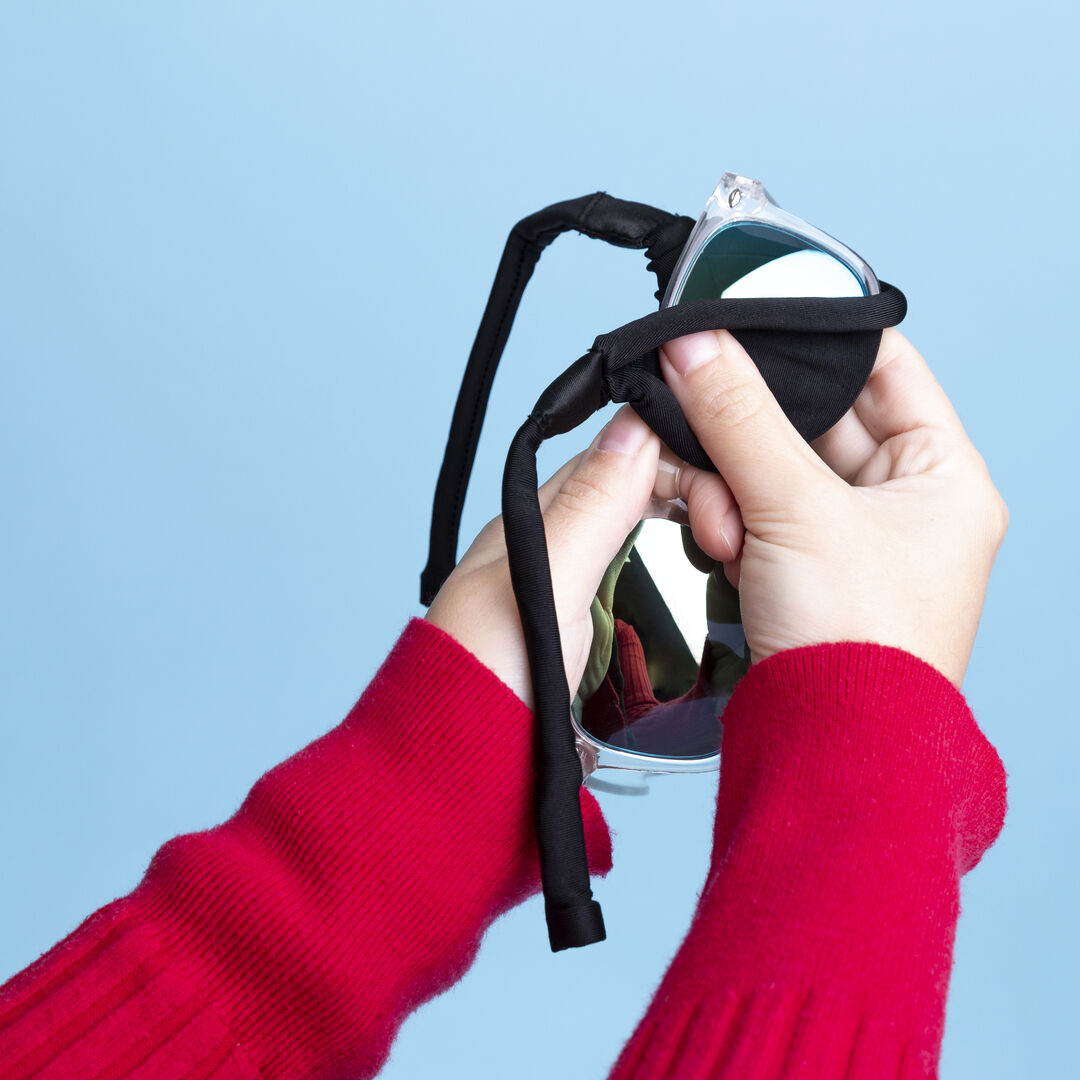 Cinta multiusos 2 en 1 en resistente microfibra de vivos colores. Compatible con todo tipo de gafas y con paño limpiador incluido.