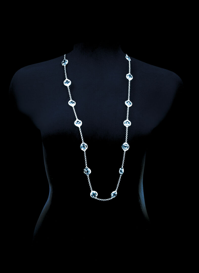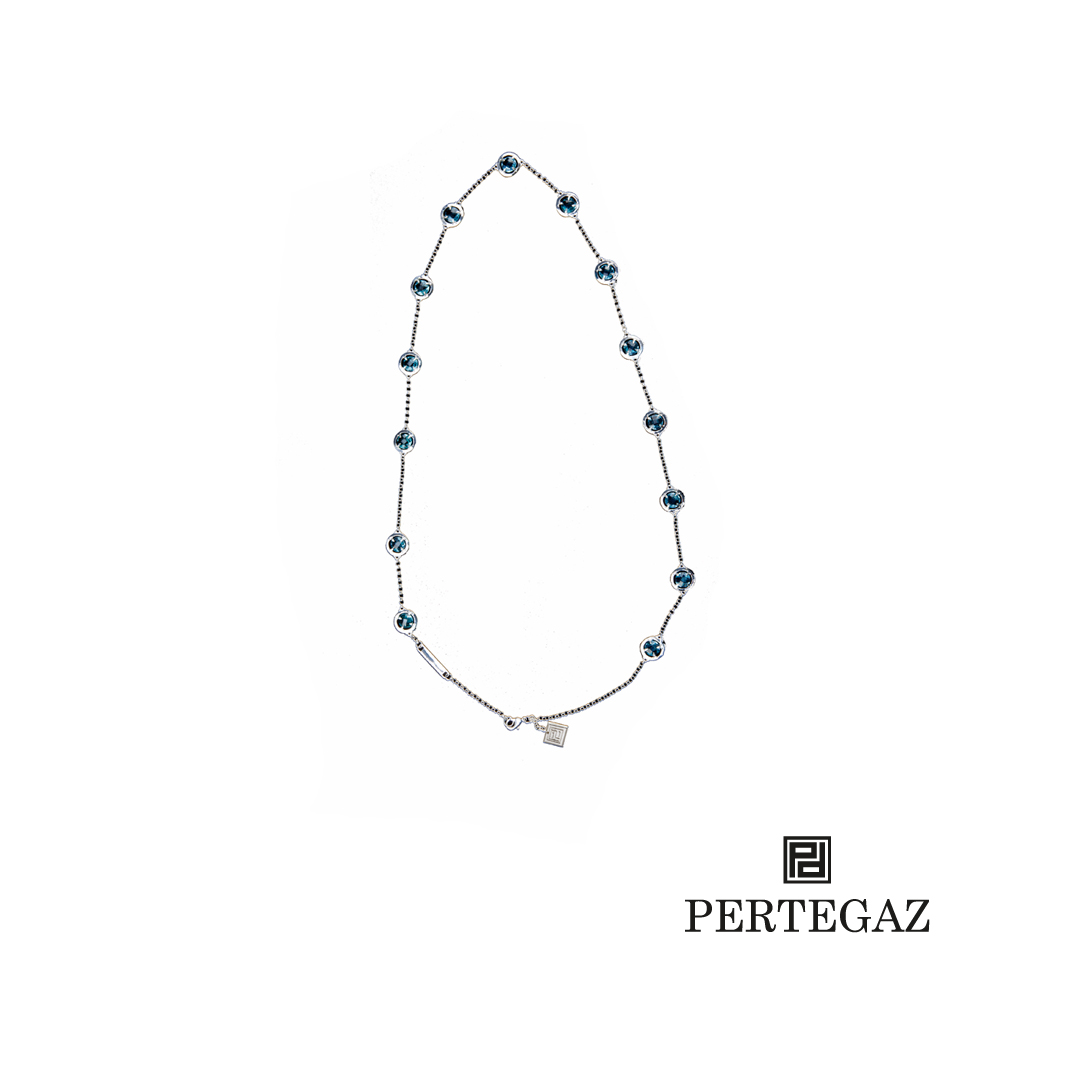 Collar de Pertegaz en metal lacado con diseño de brillantes azulados y chapita con logotipo de la marca. Presentado en funda individual.