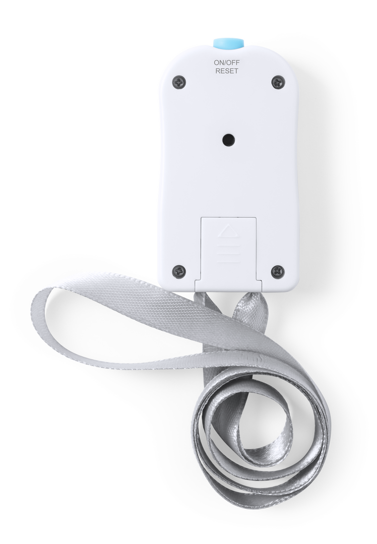 Contador de aforo digital fabricado en resistente material ABS de acabado brillo, con práctica cinta de poliéster y amplios pulsadores para añadir o restar aforo. Pantalla digital con contador de 4 dígitos y botón de reinicio en parte superior. Amplia sup Pila Botón Incluida