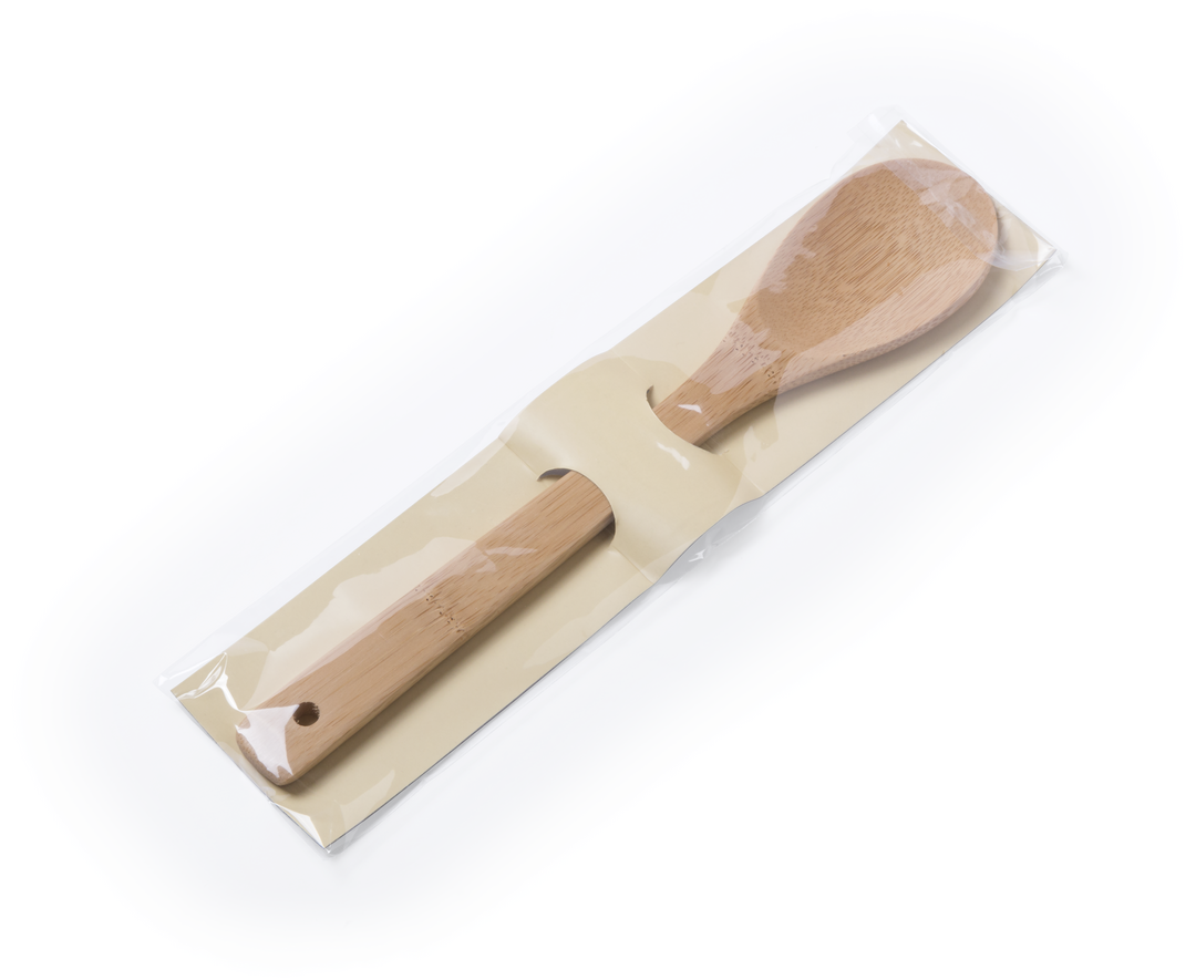 Cuchara de cocina en madera de bambú. Presentada en bolsa individual con cartón troquelado de refuerzo.